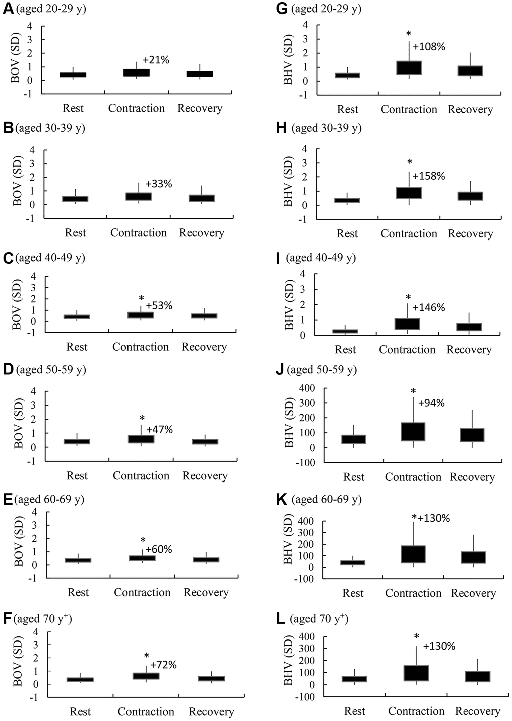 Age breakdown of BOV and BHV responses against maximal handgrip muscle contractions are presented separately in Figure 2. A significant main effect of exercise response for both BOV and BHV was consistently observed (rest vs. contraction, α < 0.01). This acute response of BOV and BHV returned quickly during the 30-s recovery period (contraction vs. recovery, α < 0.05). Small increases in BOV above resting levels (+21% and +33%) during a maximal handgrip muscle strength test were observed in the young adults aged <40 y (A, B) (main effect of time, α < 0.05). From age 40–88 y, the muscle contraction-induced increases in BOV above rest were doubled (C, D, E, F) (main effect of time, α < 0.05). The muscle contraction-induced increases in BHV were mostly >100% above the rest phase at all age levels (G, H, I, J, K, L). Despite a similar pattern across all ages, the scale of the BHV changes for adults aged after 50 y was >100 folds of their young age counterparts (main effect of time, α < 0.001).