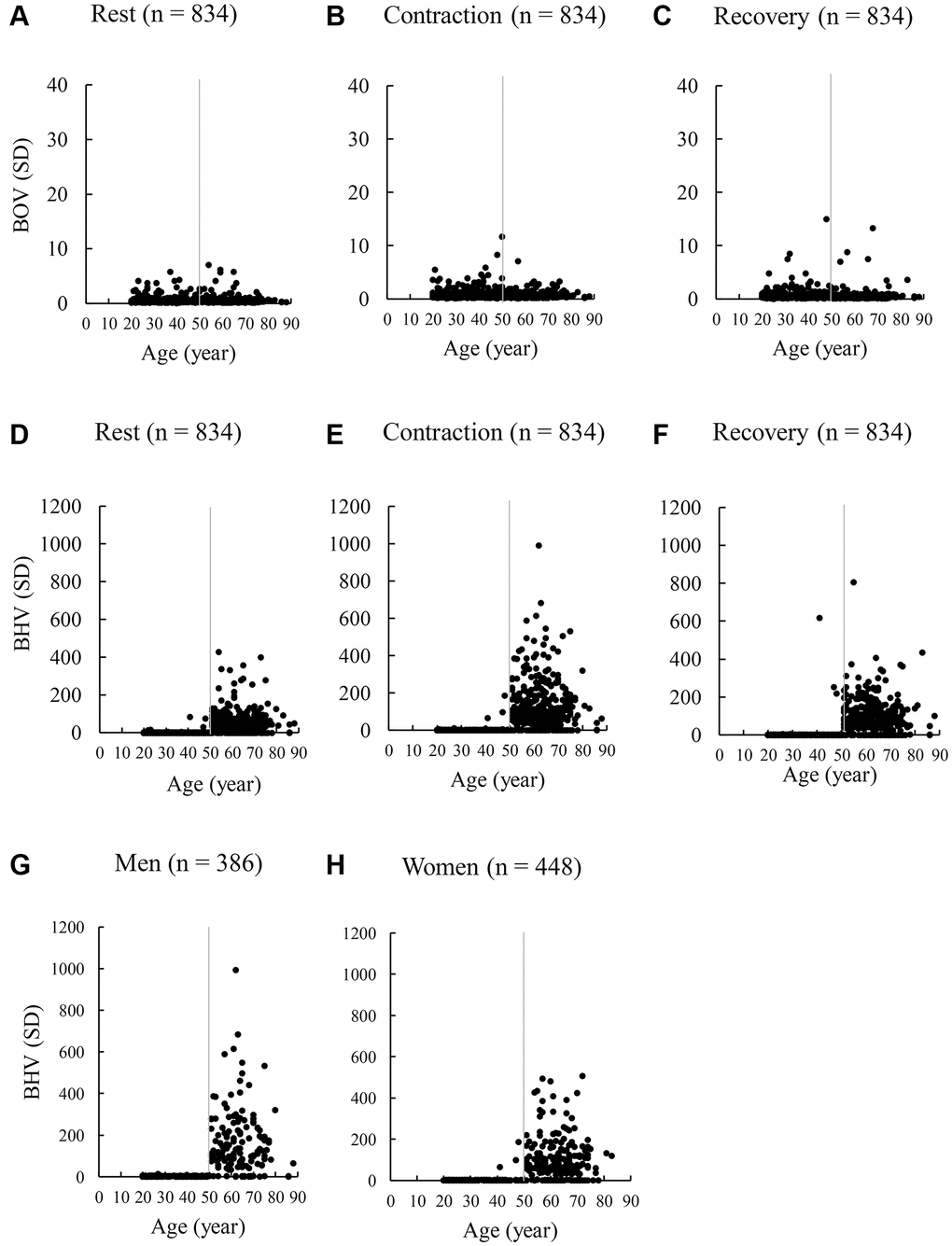 Figure 3 shows scatter plots of BOV and BHV values of all participants (n = 834) from age 20 to 88 y. This result indicates an apparently low BOV values during rest (A), contraction (B), and recovery (C) (stable oxygenation levels) compared with BHV for participants aged 20–88 y, suggesting a preservation of high stability in brain oxygenation across a wide age range. BHV values in the individuals aged above 50 y (D, E, F) were much higher than their young age counterparts (aged 20–50 y). A sharp cutoff point after age 50 for the age-dependent increases in BHV was very prominent for both men and women (G, H). Therefore, potential bias is unlikely. The ratio of population escaped from normal range (95% CI of 20–29 y) of BHV values does not appear to increase until age 50 y. In particular, the percentage of the population exceeding the upper ceiling of normal range (95% CI) of their young age counterparts are 11% (20–29 y), 11% (30–39 y), and 7% (40–49 y), 85% (50–59 y), 81% (60–69 y), and 80% (70+ y) (α < 0.001). The sharp cut-off point of BHV after age 50 y is also similar at rest and recovery phases (D, F).