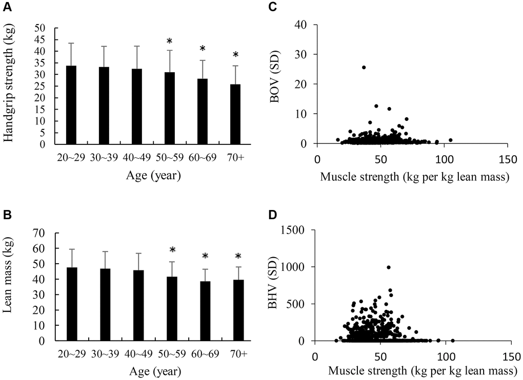 Figure 4 presents the average values of maximal handgrip muscle strength and lean body mass of participants from age 20 to 88 y. Adults aged >50 y had slightly lower maximal handgrip muscle strength (A) and lean body mass (B) compared with those at younger aged 20–29 y (α < 0.05). The scatter plot shows a non-linear relationship between BOV and muscle strength (kg per kg body weight in percentage) (C). Adults with the highest muscle strength (>75 kg per kg body weight) showed very low incidence of both high BOV and high BHV compared with those with low muscle strength counterparts (D).