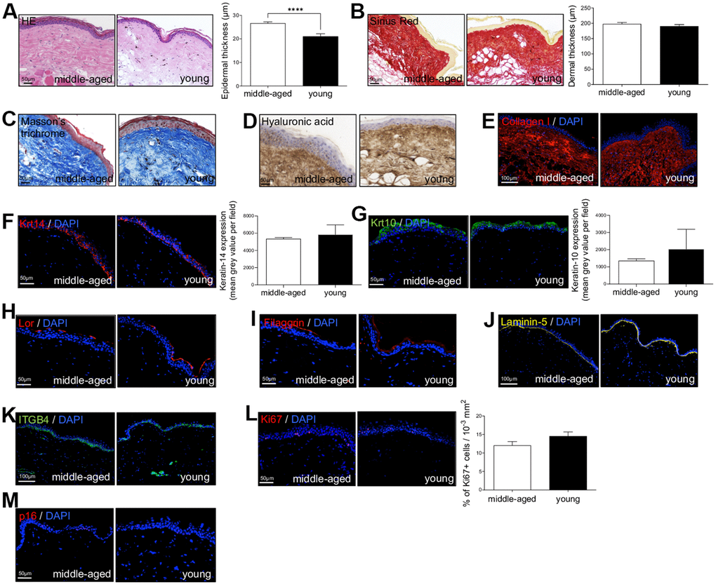Constantly exposed to both internal and environmental stresses such as UV radiation or air pollutants, the skin ages and undergo profound changes in its appearance and functions. Indeed, aged skin undergoes gradual structural and functional degeneration, leading to thinning of epidermal and dermal layers, loss of elasticity, wrinkling and dryness. These changes are responsible for delayed wounding, more frequent infections, pruritus, enhanced allergen/irritant penetrations with variable degree of dermatitis and eventually carcinogenesis. In rodents and humans, these phenomena have been partially attributed to loss or lineage skewing of keratinocytes stem cells and immune cells, and/or the regulation of their niches, altering normal homeostasis and tissue repair [3–7].