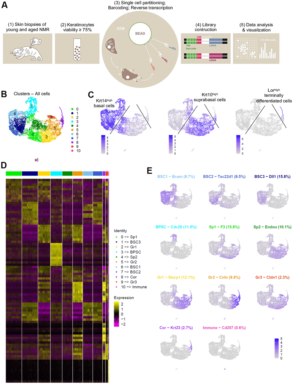 The skin epidermis is constantly rejuvenated by keratinocyte stem cells found in the basal layer that are capable of both proliferation and differentiation. But aging skin experiences a progressive decline in homeostatic and regenerative capacities, potentially attributed to degenerative changes in these stem cells and/or their niches [3–7]. Using single-cell RNAseq, we analyzed the cellular composition of the NMR epidermis to investigate the potential link with their slower rate of skin aging.