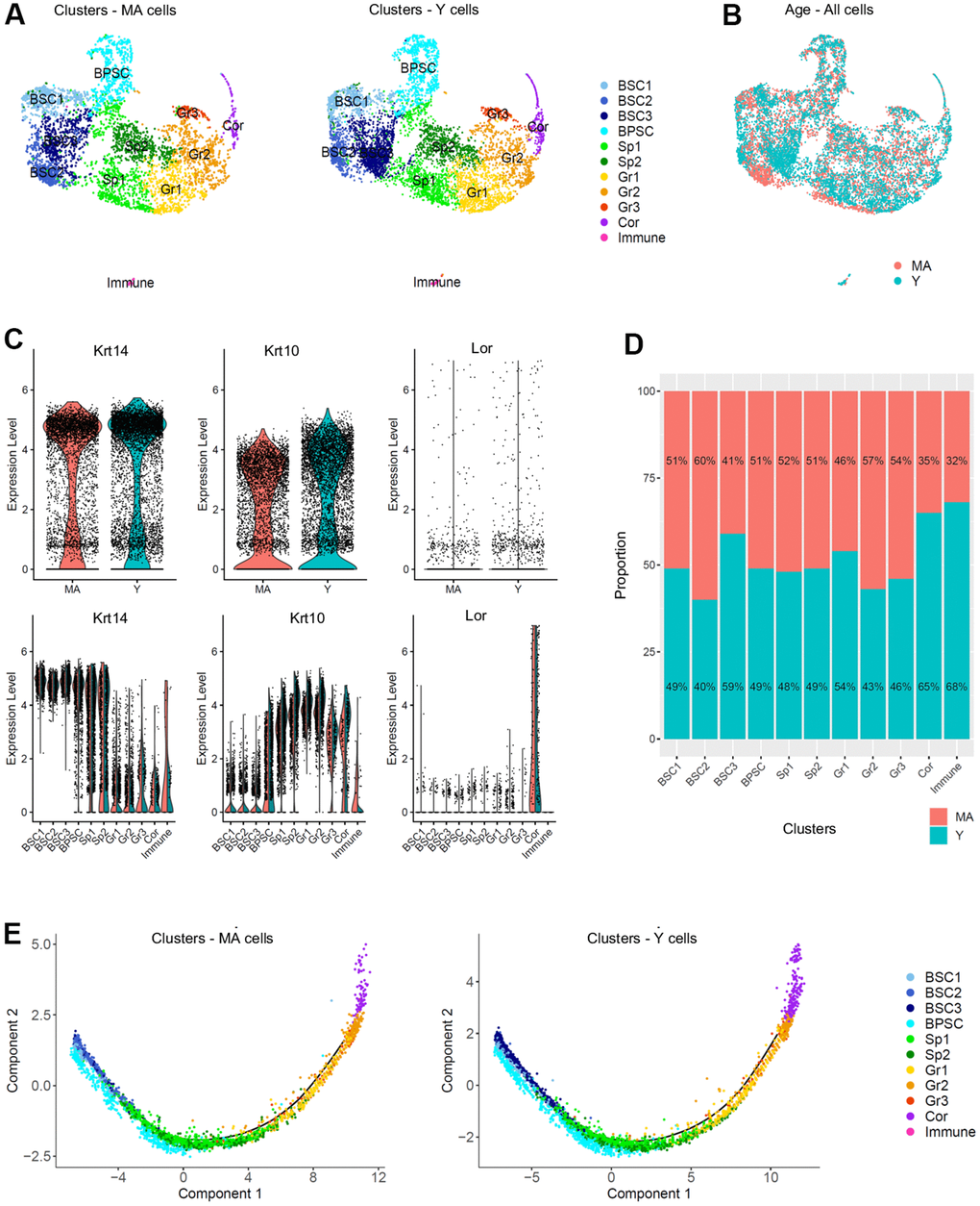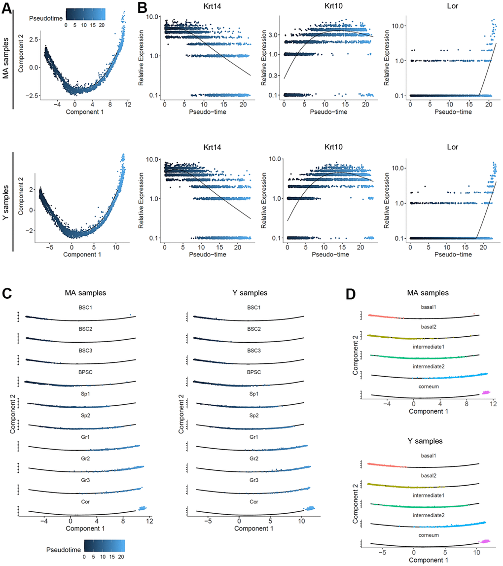 Single-cell trajectory was constructed using M3Drop [PMID:30590489] and Monocle v2.10.1 [PMID:28825705]. Input genes for Monocle trajectory construction were selected using an unsupervised approach via M3Drop result, which identifies differentially expressed genes based on a Michaelis-Menten function for the relationship between mean expression and dropout rate, the relevant genes being the ones shifting above a fitted curve. The default Monocle workflow was then performed to generate the trajectories, with focus on known markers expression profiles (Krt14, Krt10, Lor) to select the appropriate trajectory orientation. We utilized Monocle 2.6.425 to order cells in pseudotime based on their transcriptomic similarity. Pseudotime-dependant genes have been identified using differential GeneTest function from Monocle. Those genes were the most significant in this context and Monocle reconsidered this list of 820 genes and kept the majority of them for the analyses (791 pseudotime-dependent genes). The differential test was performed on genes used to construct Monocle trajectory on cells from Young samples and selected according to q-value (lower than 0.05). Clustering of these genes was done by Monocle functions. Heatmaps for Y and MA samples used this clustering of genes.