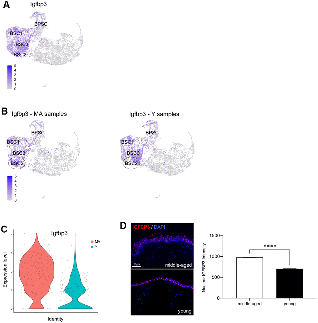 Previous studies have demonstrated that cutaneous gene expression levels change with age, but NMR cutaneous gene expression showed a remarkable stability with age (see above). However, as subtle differences might exist, we performed a more in-depth analysis between Y and MA animals within each cluster independently. Using a p-value below 0.05 and an average logFc above 1, only 2 differentially expressed genes in BSC2 cluster (ENSHGLG00000002542/Rps2 and Igfbp3) were overexpressed in MA NMR (Supplementary Data File 4). Rps2 gene encodes a ribosomal protein that is a component of the 40S subunit, with unknown role in skin homeostasis. Interestingly, Igf/Igfbp signaling plays an important role in aging processes and mediates epidermal proliferation and skin peripheral immunity. Igfbp3, one of six IGF binding proteins, was found located in the basal/germinative layer of the epidermis and modulates epidermal homeostasis. Here, using UMAP visualization, we retrieved its expression in basal stem and proliferative clusters BSC1-2-3 and BPSC (Figure 5A). In mice and humans, Igfbp3 transcript is significantly reduced with increasing age [4, 28, 32, 33]. In NMR, Igfbp3 expression was almost 4 time higher in the BSC2 cluster of older animals as compared to the younger ones (Figure 5B, 5C and Supplementary Data File 4). Confirming our scRNA-seq data, IGFBP3 nuclear expression assessed by immunohistochemistry was increased in older animals (Figure 5D). Moreover, 5 differentially expressed genes in immune cluster (S100a9, ENSHGLG00000004445/S100a8, Krt17, S100p, and Krt5) were overexpressed in older animals. Interestingly, no differentially expressed genes typical of LC were found, suggesting the stability of these cells over time in the NMR (Supplementary Data File 4).
