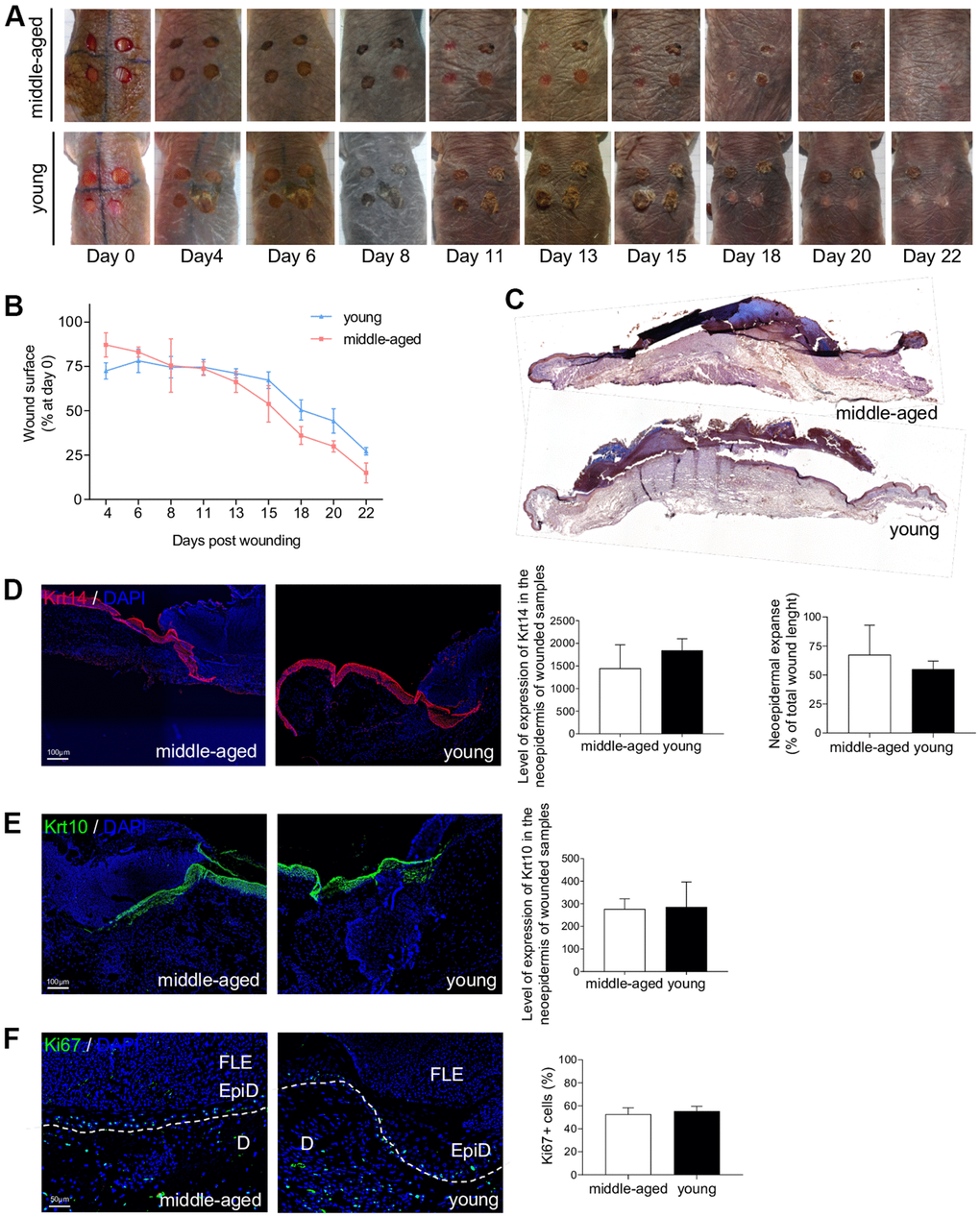 The ability of the skin to heal quickly and completely is a major function that characterizes the skin status. Epidermal stem cells, and their crucial role in the cutaneous healing process, have been extensively studied in mice and humans [33, 44] but never in NMR. Stem cell dysfunction is a hallmark of aging and is associated with impaired wound healing in older rodents and humans [5, 7, 45]. The delayed skin aging in the NMR prompted us to investigate the wound healing process in young and older NMR. Punch biopsy devices were used to create surgical wounds on the backs of Y and MA NMR and the wound closure rate was measured (percentage of wound closure at day 0) for the first time in these animals. Unlike normal mice that possess a healing time course of approximately 5 days, NMR appeared to heal at a slower rate of 22 days but with less scarring (Figure 6A, 6B). In humans and mice, wound closure occurs more rapidly in younger than older individuals [5, 7, 45]. Our results showed that in NMR, despite an age difference of 11 years, the wound closure rate of MA animals followed the same kinetic as the one of Y animals (Figure 6B). Next, we investigated re-epithelialization at day 7 post-wounding as an essential component of wound healing and used as a defining parameter of its success (Supplementary Figure 7A). A well-organized neo-epidermis of the same thickness between Y and MA was measured (Figure 6C and Supplementary Figure 7B). In all individuals, the same levels of expression of basal Krt14 and differentiated Krt10 cell markers were found and the neo-epidermal tongue expanse was substantially identical between the 2 groups (Figure 6D, 6E). The epidermal tongue proliferation rate measured using Ki67 immunostaining remained stable between Y and MA animals (Figure 6F).