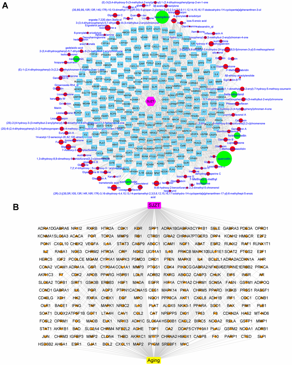Identification of putative targets of SZJT candidate compounds was performed with TCMSP and Drugbank (https://www.drugbank.ca/) [20, 22]. The target protein names were transformed into the corresponding gene symbols by the UniProt database (https://www.uniprot.org) [23]. “Aging” was used as a key word to search for targets related to aging. The predicted targets of aging were collected from the GeneCards database (https://www.genecards.org, verb4.9.0) [24], NCBI (https://www.ncbi.nlm.nih.gov/gene) [25] and OMIM databases (http://www.omim.org/, updated December, 30, 2020) [26]. The species was set to be “Homo Sapiens”. Then, aging related genes found in the three databases were merged, the replicate genes were deleted.
