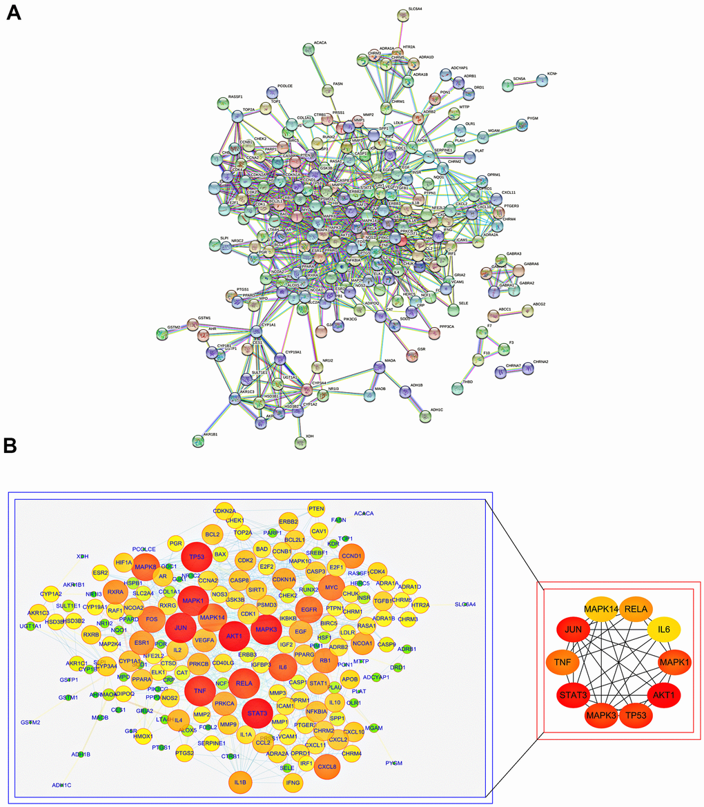 To further understand the molecular mechanism of aging and the functions of specific proteins, the STRING database was used to construct an SJZT-aging PPI network (Figure 2A). According to the topology analysis, the targets (degree score≥106), in order of degree score from high to low, were as follows: AKT1, STAT3, JUN, MAPK3, TP53, MAPK1, TNF, RELA/p65, MAPK14 and IL6. These ten target genes interact most closely with other targets. The results suggest that AKT1, STAT3, JUN, MAPK3, TP53, MAPK1, TNF, RELA/p65, MAPK14 and IL6 may be the core targets of the hub genes (Figure 2B). In the follow-up, it was necessary to further determine the core targets according to with results of molecular docking. The results provide a basis for determining the anti-aging effects of kaempferol and quercetin and the reliability of the virtual prediction of the molecular docking method.
