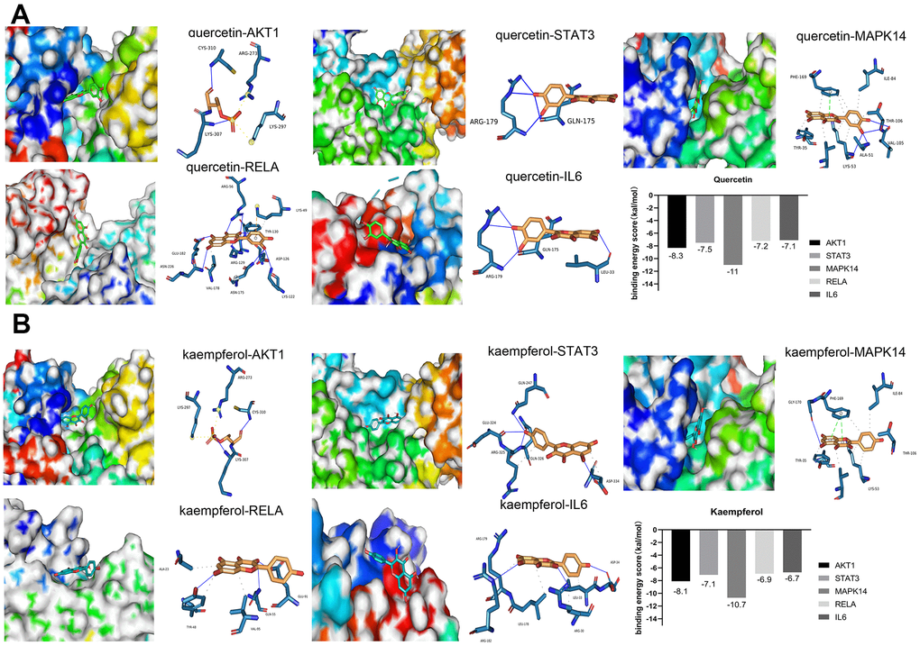 To improve the accuracy of the connection between small molecular compounds and the core target proteins, we used molecular docking to evaluate the interactions between compounds and target proteins. It is generally believed that when the binding energy of a ligand and receptor is <−4 kcal/mol, there is potential binding activity between the ligand and receptor [35]. A binding energy score less than −5 kcal/mol suggests strong binding between the ligand and receptor [36, 37]. The results of molecular docking showed that kaempferol and quercetin, two important compounds in SJZT, had good affinity for the top ten core targets. Among the top ten core proteins, AKT1, STAT3, MAPK14/P38, RELA/p65, and IL6 proteins exhibited much lower binding energies than other proteins, indicating that these five targets bound tightly to SJZT (Figure 3A, 3B). Therefore, given the molecular docking results and the roles of these targets in aging, we selected AKT1, STAT3, MAPK14/P38, RELA/p65, and IL6 proteins as the core targets.