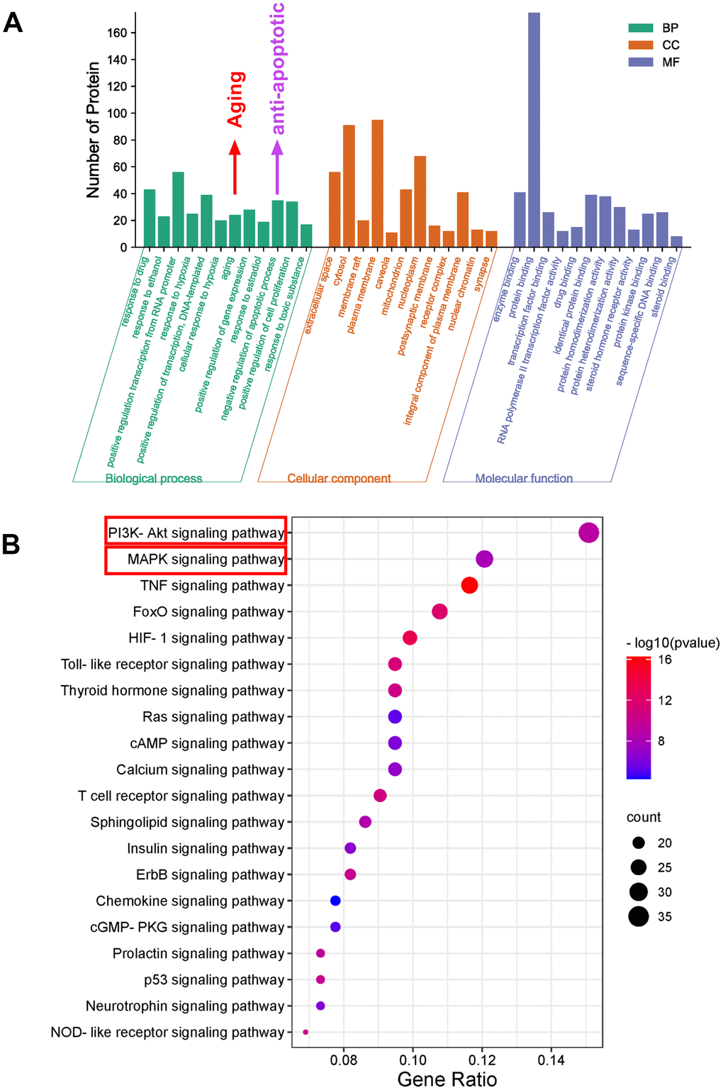 Because signalling pathways can act systematically against aging, we explored pathways in aging. Subsequently, we performed enrichment analysis of KEGG pathways on the 235 hub targets (Supplementary Table 4). The top 20 signalling pathways by P value are presented (Figure 4B). The KEGG results indicated that the PI3K-AKT and MAPK signalling pathways were the most important. To further verify these two pathways, we carried out biological verification.