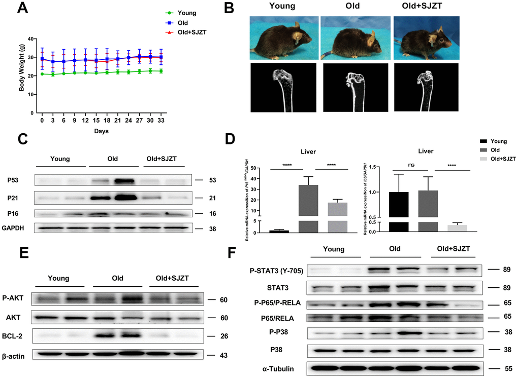 The individual herbs were provided by Jiang Yin Tian Jiang Pharmaceutical Company. The animal experiments were approved by the Experimental Animal Ethics Committee of the KUST Medical school and conformed to the principles of animal protection, animal welfare and ethics and the relevant national guidelines. The mice were raised in standard conditions at 23° C ± 2° C and 55% ± 15% humidity on a 12 h light dark cycle, and fed a normal diet. The 16-month-old mice were randomly divided into 2 groups and oral administration (10g/kg/day) with SJZT or saline. Two-month-old mice were used as the young control group. The body weights of all groups were recorded every three days. After 4 weeks, the mice were sacrificed to collect tissue for further analysis.