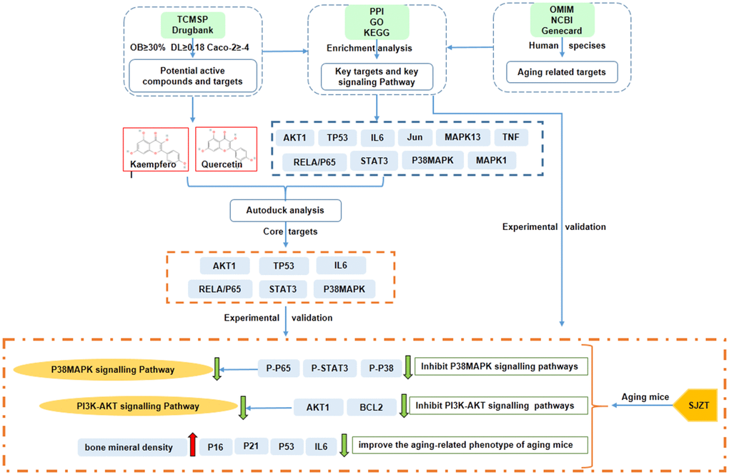 In this study, we used a network pharmacology method to analyse the interactions among active compounds, potential targets and target diseases of SJZT. According to the preliminary analysis results, we studied the mechanism by which SJZT regulates the P38MAPK and PI3K-AKT signalling pathways in the treatment of aging in a mouse model of natural aging. And these findings were consistent with the network pharmacology prediction.