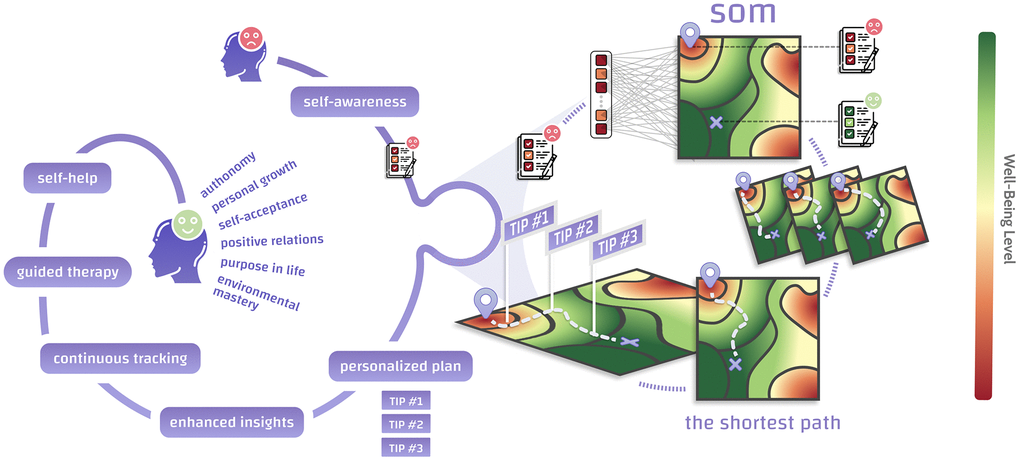 SOMs have already been used to describe mental health in humans. For example, an SOM classifier has been trained to determine mental disorders in based on patients’ transcribed speech [74]. SOMs do not require sample labels to be trained which greatly facilitates data collection and preparation stages of a research project. The cited model has reached high (97%) accuracy while predicting the type of a mental diseases. SOMs have also been employed to detect psychological stress based on biometric data from wearables and phone usage [75]. These models, however, are not based on easily interpretable and actionable features, and thus, are not fit to serve as an mHealth application or a therapy tool.
