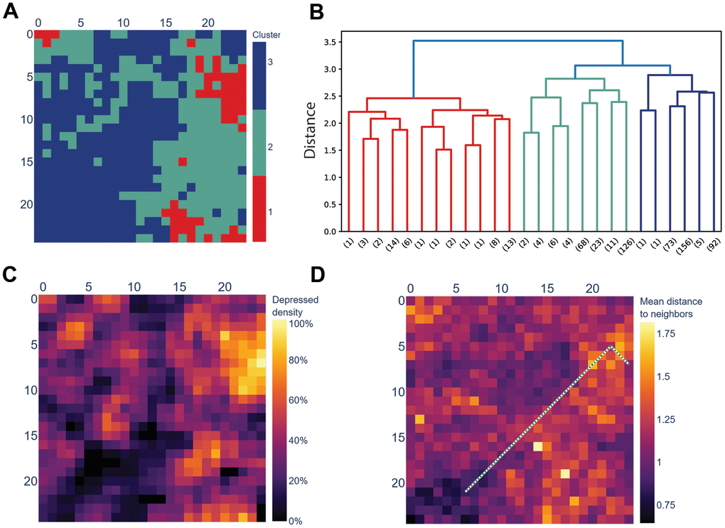 The SOM we obtained contains 625 cells organized in a 25 × 25 grid. Each psychological profile matches only one cell, while each cell may have multiple matching profiles. By design, SOMs ensure that subjects with similar psychotypes occupy the same cell. Conversely, more dissimilar psychotypes will be farther apart on an SOM.