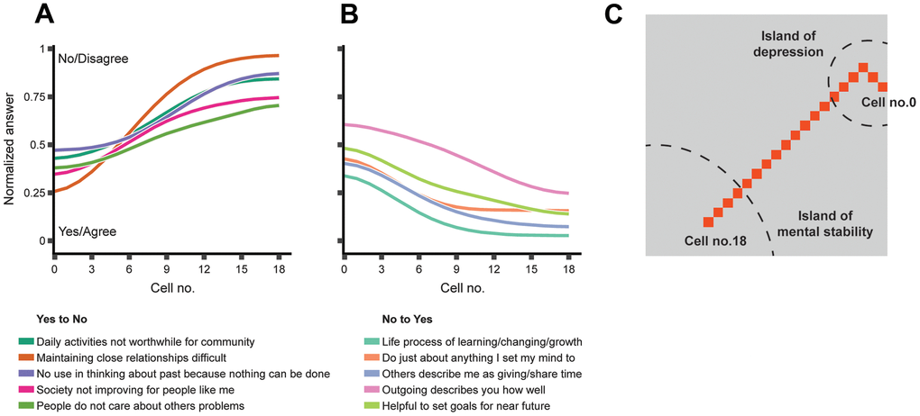 The geometric nature of an SOM allowed us to treat it as an actual map to mark paths connecting regions of interest. In this particular case, we chose to mark the path between the depression hotspot in Cluster-1 and the most depression-resilient cell in Cluster-3 (Figure 2D). This path might be interpreted as a sequence of gradual changes that a depressed individual should go through to overcome their condition (Figure 3).