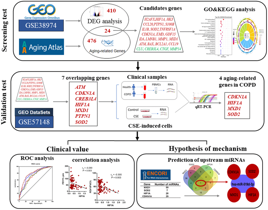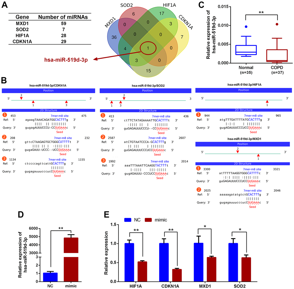 In conclusion, this study identified hsa-miR-519d-3p and four aging- and COPD-related genes (HIF1A, CDKN1A, MXD1, and SOD2) that may influence the development of COPD. Further study of these new targets may lead to new insight into the pathogenesis, diagnosis, and treatment of COPD.