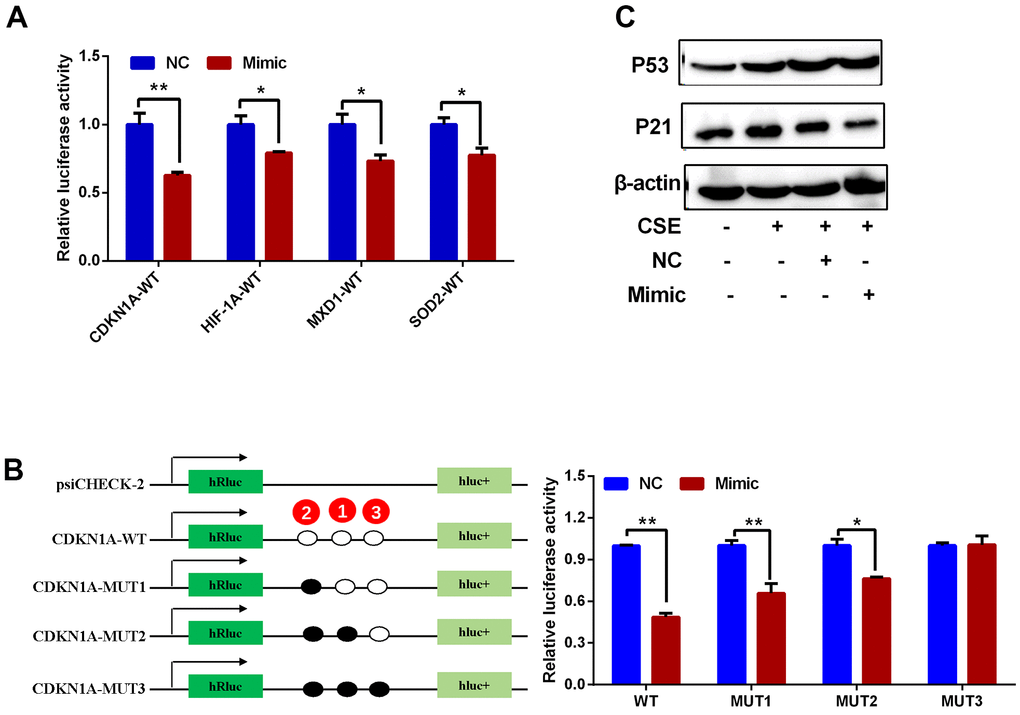 Upstream miRNAs for CDKN1A, HIF1A, MXD1, and SOD2 were predicted using the StarBase3.0 software, and miRNA candidates that were identified by at least four different target-predicting programs were considered hits. The predicted miRNAs are shown in Supplementary Table 3. There were 29, 28, 59 and 7 miRNAs predicted to target CDKN1A, HIF1A, MXD1, and SOD2, respectively. hsa-miR-519d-3p was the only miRNA predicted to target all four genes (Figure 10A) with 3, 1, 2, and 3 potential interaction sites on the CDKN1A, HIF1A, MXD1, and SOD2 mRNA sequences, respectively. The seeding matched sequences are shown in Figure 10B. Subsequently, the expression of hsa-miR-519d-3p in PBMCs from COPD and normal groups was quantified by qRT-PCR, with hsa-miR-519d-3p expression significantly decreased in COPD patients, compared with the normal controls (Figure 10C). Furthermore, overexpression of hsa-miR-519d-3p in Beas-2B cell using a mimic (Figure 10D) significantly decreased the expression of CDKN1A, HIF1A, MXD1, and SOD2 (Figure 10E). Luciferase reporter assays were used to investigate the interaction of hsa-miR-519d-3p with the four genes. As shown in Figure 11A, the luciferase activities of psiCHECK2 vectors harboring wild-type 3’UTR sequences for these four genes were all reduced after co-transfection with the hsa-miR-519d-3p mimic, and the CDKN1A considerably more reduced than the other three genes. The luciferase activity of psiCHECK2 vectors harboring mutational 3’UTR sequences of CDKN1A was also measured, while the luciferase activity not significantly different in the presence of hsa-miR-519d-3p after mutating all predicted interaction sites (Figure 11B). This suggests that hsa-miR-519d-3p can bind to 3’-UTR position of the CDKN1A transcript to inhibit expression. Finally, overexpression of has-miR-519d-3p decreased the expression of p21 (the protein encoded by CDKN1A) in Beas-2B cells (Figure 11C).