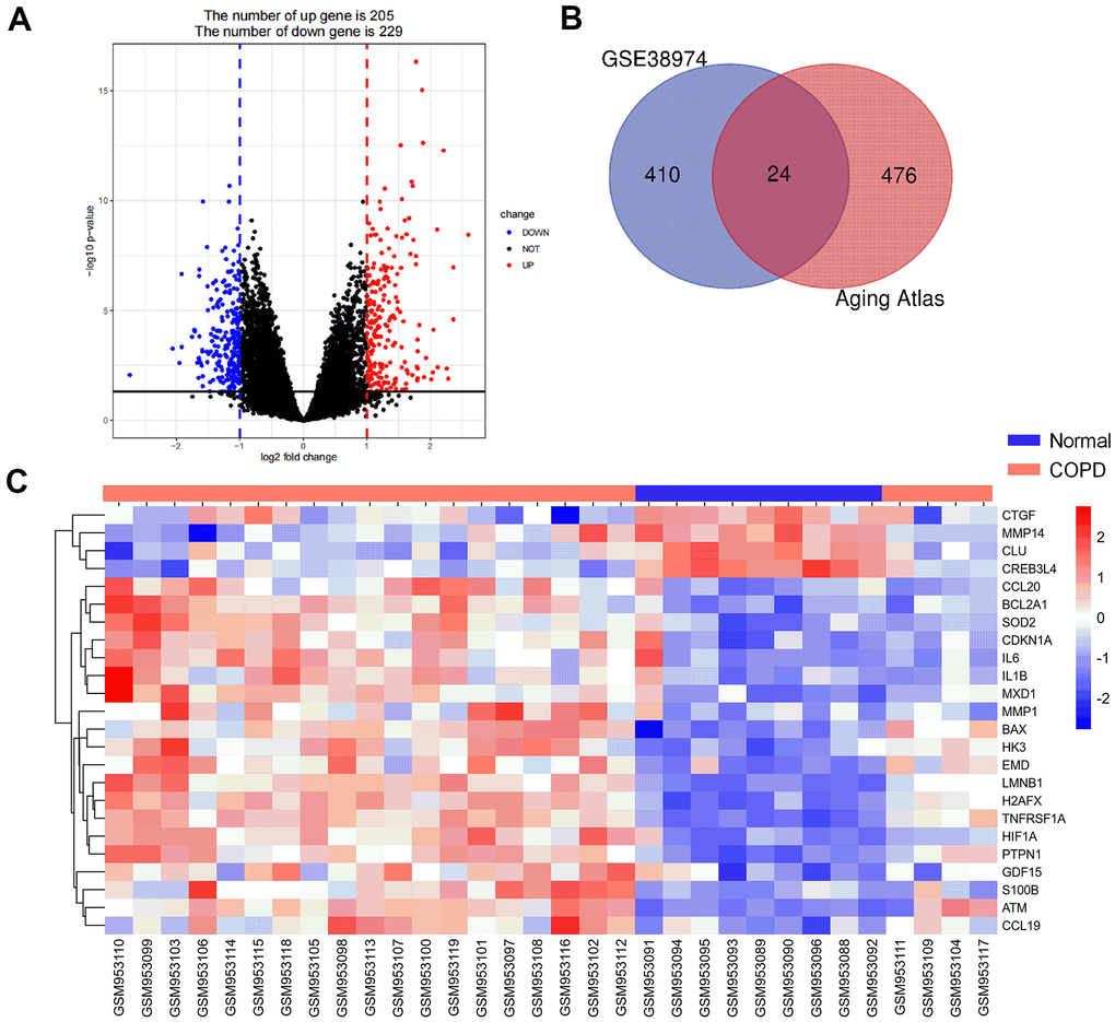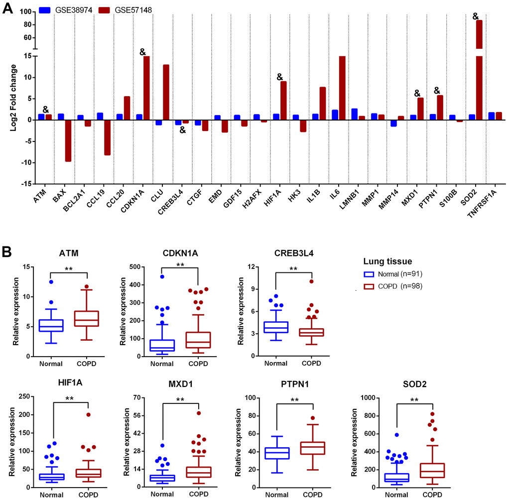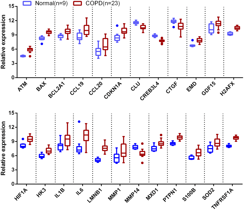 Aging is the important physiological and pathophysiological processes in human life, which involves inflammation, oxidative stress, mitochondrial dysfunction, epigenetic alterations, cell senescence and death, and regulates COPD development. Dysregulation of aging-related genes, such as SIRT1 and SIRT6, were recently demonstrated to be associated with COPD [9–14]. Previous studies showed that the reduction of SIRT1 and SIRT6 expression could exacerbate the response to oxidative stress, premature senescence and chronic inflammation, which further accelerate the aging process in the lung [11–13]. The activity of SIRT1 may be partially enhanced by treatment with the anti-inflammatory molecule Resveratrol to reverse the progression of CSE-induced COPD [14]. Li et al. found that Klotho, an anti-aging protein, could inhibit the expression of inflammatory mediators such as MMP-9, TNF-α, and IL-6 via the NF-κB pathway in COPD [15]. Another study demonstrated that Klotho down-regulation in COPD was associated with accelerated lung aging in COPD development and increased oxidative stress, inflammation, and apoptosis of airway epithelial cells [16]. However, the roles of aging-related genes during COPD development remain largely unknown.