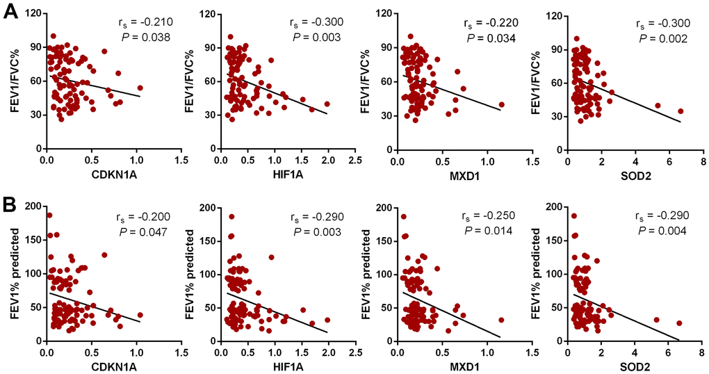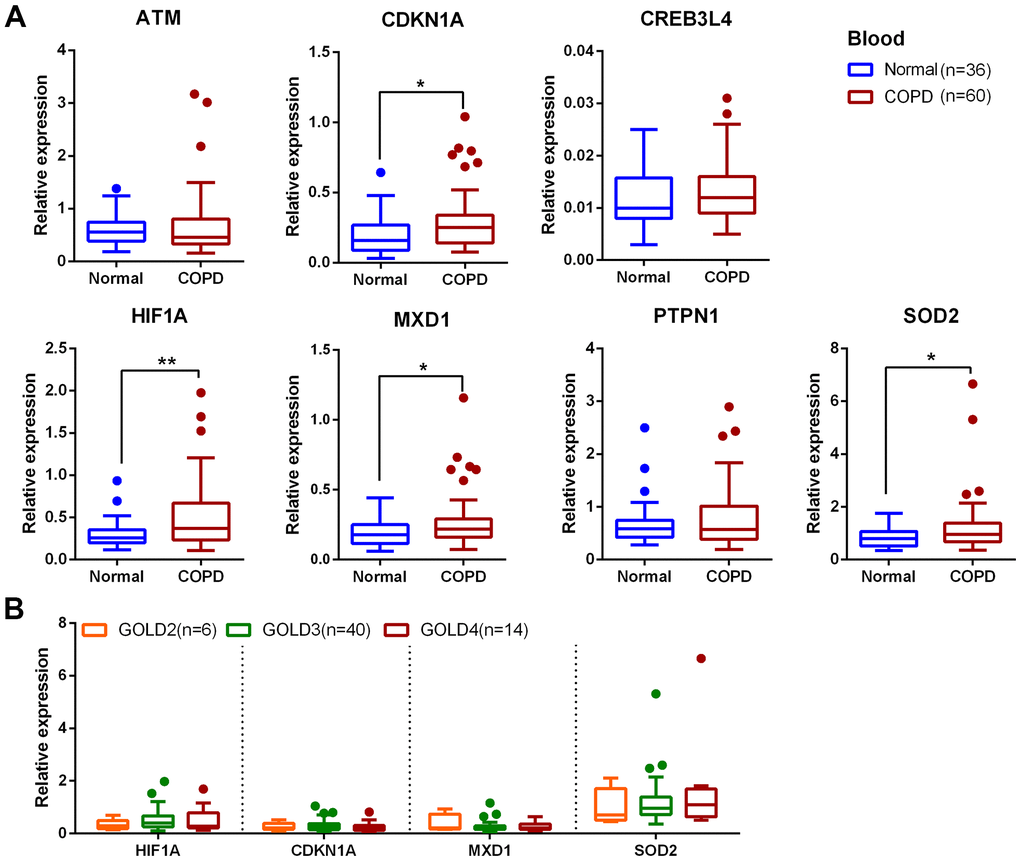 In this study 24 aging- and COPD-correlated genes were identified using a variety of bioinformatic approaches. These 24 genes principally involved in TNF, NF-κB, IL-17, HIF-1 signaling pathways, which were associated with COPD pathophysiology, such as aging, inflammation, and oxidative stress [32–34]. The genes identified in this study (CDKN1A, HIF1A, MXD1, and SOD2) were significantly upregulated in lung tissues in two different clinical COPD transcriptomics datasets, and had the potential to develop as therapeutics targets of COPD. Although the lung is the principal target organ in COPD, the blood biomarkers are increasingly applied to in diagnosis and prognosis of conditions due to the collection and dynamic monitoring easily. Hence, we validated the above four genes in blood samples from a new third cohort, and have found that the trend of the relative expression of these genes are consistent in blood and lung tissue. Furthermore, the expression of these genes was negatively correlated with pulmonary function in our validated cohorts.