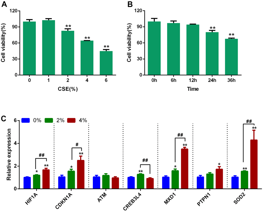 Beas-2B cells were seeded into 96-well plates at a density of 5 × 103 cells/well and incubated overnight, then treated with CSE at 0, 1, 2, 4 and 6%. Cell viability was measured at different times (0, 6, 12, 24, and 36 hours) using cell counting kit-8 (CCK-8) reagent (YEASEN, China) according to the manufacturer’s instructions. After an incubation with CCK-8 reagent for 2 hours, the optical density was measured at 450 nm using a microplate reader (Bio-Rad Laboratories, USA). Cell viability was calculated by the following formula: (absorbance of treatment group/absorbance of control group) × 100%.