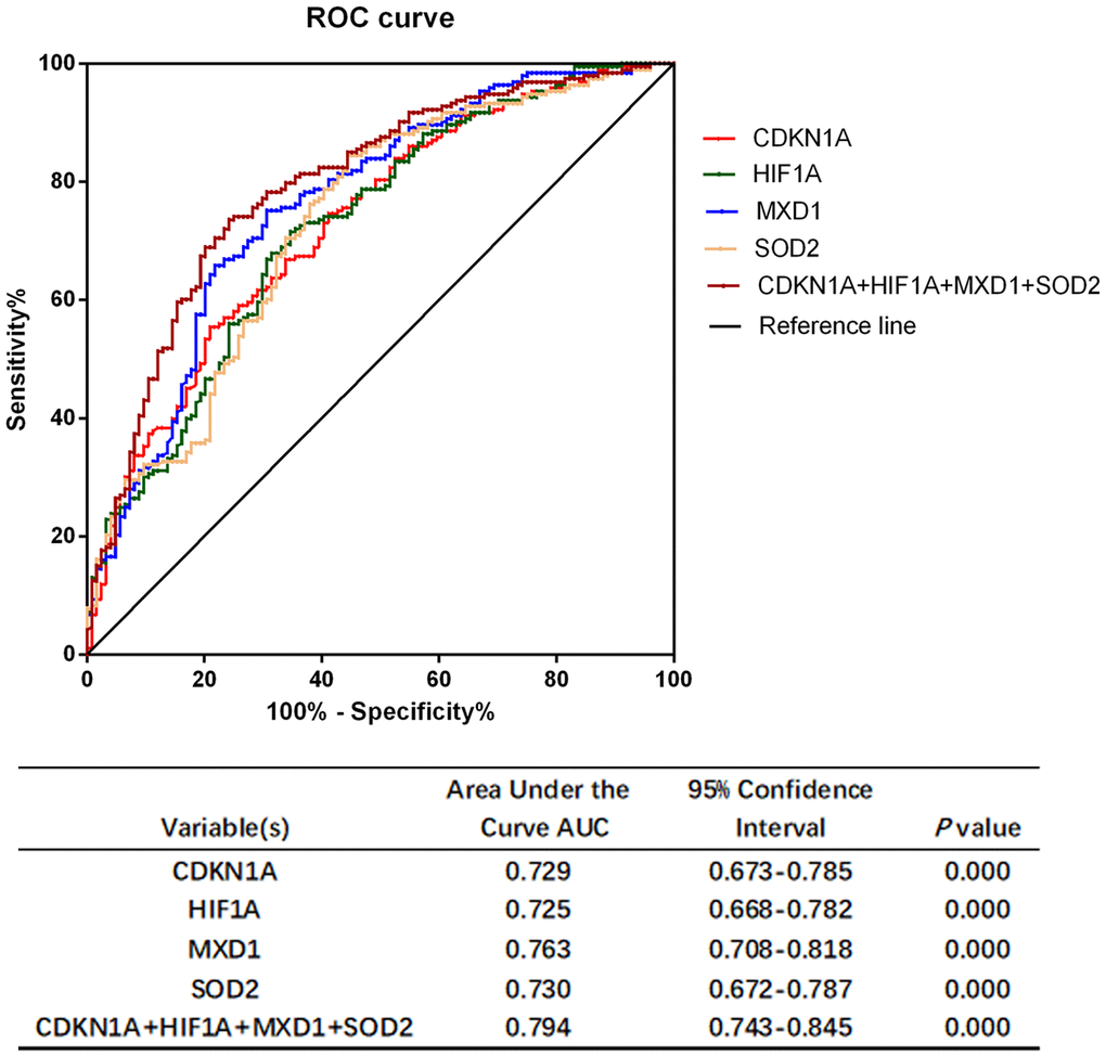 The severity of COPD is largely related to symptoms, exacerbations and comorbidities, while underdiagnosis of COPD is a common problem worldwide. The current diagnosis of COPD is depending on spirometry and patients’ demographic characteristics that could contributed to overdiagnosis or misdiagnosis aperiodically [50]. Diagnostic tests based on biomarker combinations are often evaluated by the area under the ROC curve analysis to discriminate individuals who have disease and individuals who are disease-free to assisting the clinical diagnosis [51]. In this study, the AUC values of CDKN1A, HIF1A, MXD1, and SOD2 were all greater than 0.7, and the combination of the four genes showed a better discrimination (AUC = 0.794). This suggested that CDKN1A, HIF1A, MXD1, and SOD2 had excellent discriminate ability between COPD patients and health subjects. However, whether these candidate genes can be applied to clinical practice for prevention of and intervention into COPD development is currently unclear, further studies are required to explore the molecular mechanisms of COPD in vivo and in vitro.