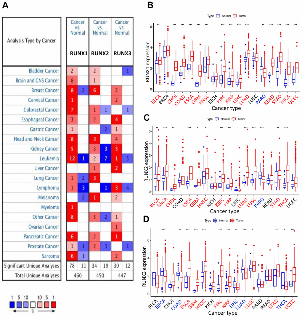 The mRNA levels of RUNX gene family members in malignancies and matched normal tissues were evaluated using the Oncomine database to compare expression levels between tumor and normal tissues. RUNX1 and RUNX2 expression was found to be quite high in head and neck cancer, kidney cancer, leukemia, and pancreatic cancer, according to our findings. RUNX1 was also shown to be greater in malignancies of the brain and central nervous system, colorectal cancer, and sarcoma. RUNX3 expression was shown to be greater in esophageal cancer, head and neck cancers, kidney cancer, lymphoma, and sarcoma than in other malignancies (Figure 1A).