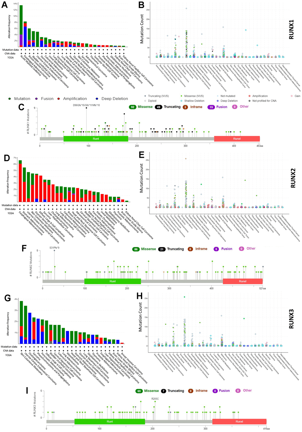 Using the cBioPortal database (10967 samples from 32 studies), we analyzed the genetic alterations of the RUNX gene family in different cancer types. Our results show that LAML had a relatively high mutation level, with RUNX1 alterations exceeding 13% with “mutation” as the primary type; the hot spot mutation of RUNX1 was D96Gfs*15/Gfs*11/Mfs*10 in the Runt domain, which occurred in nine cancers (LAML and BRCA) in nine patients and resulted in a truncated protein (Figure 10A–10C). The highest alteration frequency of RUNX2 (>6%) appeared for patients with esophageal adenocarcinoma with primary type “amplification” (Figure 10D, 10E). The RUNX2 hotspot mutation S31Pfs*9 resulted in a shortened protein and was found in five malignancies (STAD and COAD) in five individuals (Figure 10F). RUNX3 has a modest amount of genetic change when compared to RUNX1 and RUNX2. Patients with SKCM had the highest prevalence of RUNX3 mutations, with “mutation” being the most common form (Figure 10G–10I).