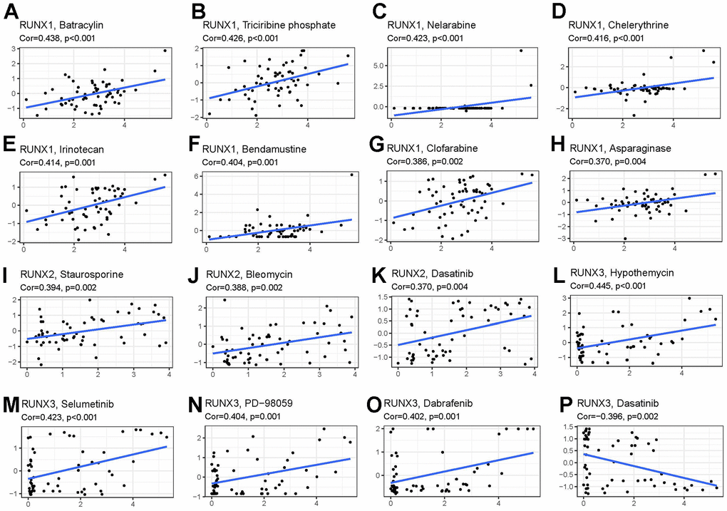 The RUNX gene family medication response information were gathered from the National Cancer Institute (NCI)-60 database through the CellMiner database (https://discover.nci.nih.gov/cellminer/home.do). The NCI-60 database comprises molecular and pharmacological information for 60 different human cancer cell lines. Pearson’s correlation analysis was used to assess the relationship between RUNX gene family expression (as measured by transcript levels) and drug response (GI50). All of the medications used in the correlation study were identified by the Food and Drug Administration or through drug clinical studies.