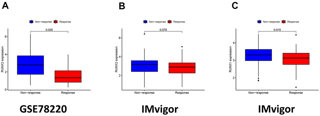 To investigate the predictive value of the RUNX gene family, two separate datasets, GSE78220 and IMvigor210, were obtained and examined. GSE78220 (platform GPL11154 Illumina HiSeq 2000) gene expression profiles and clinical data were acquired from GEO (https://www.ncbi.nlm.nih.gov/geo/) databases, which was chosen for this study as the anti-PD-1 immunotherapy cohort. The IMvigor210 dataset was obtained under the Creative Commons 3.0 license from a freely available, fully documented software and data package available, which was chosen for this study as the anti-PD-L1 immunotherapy cohorts.