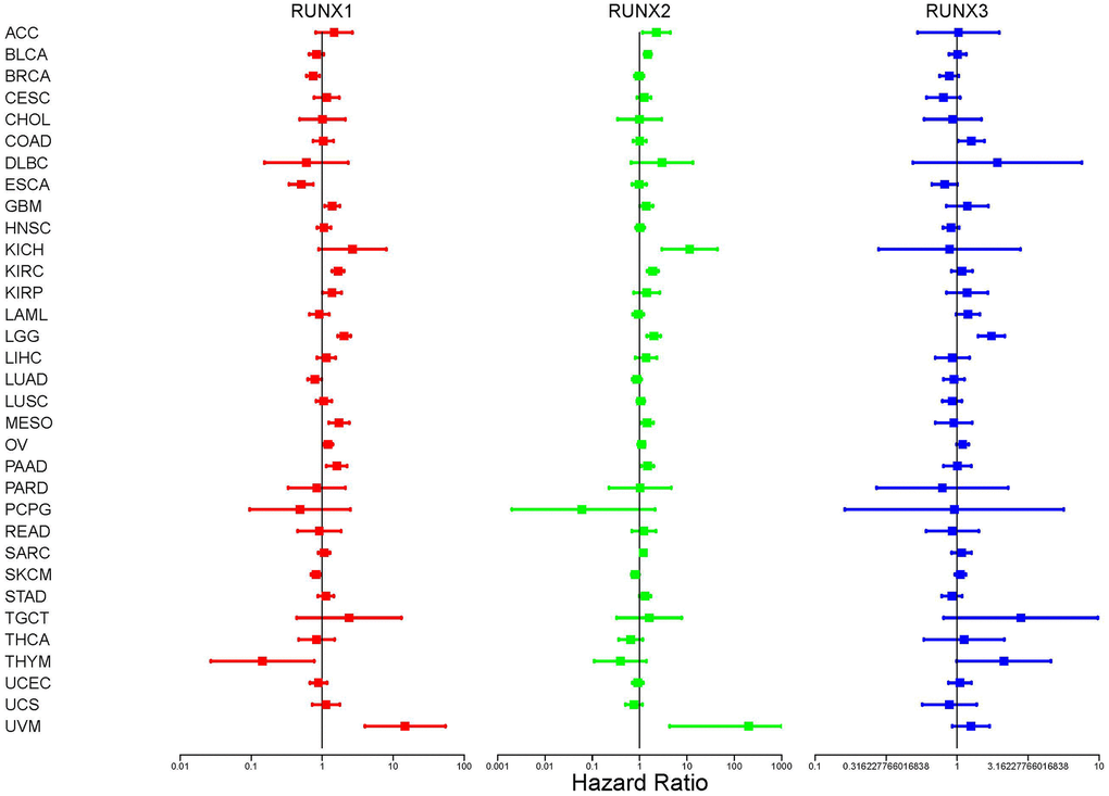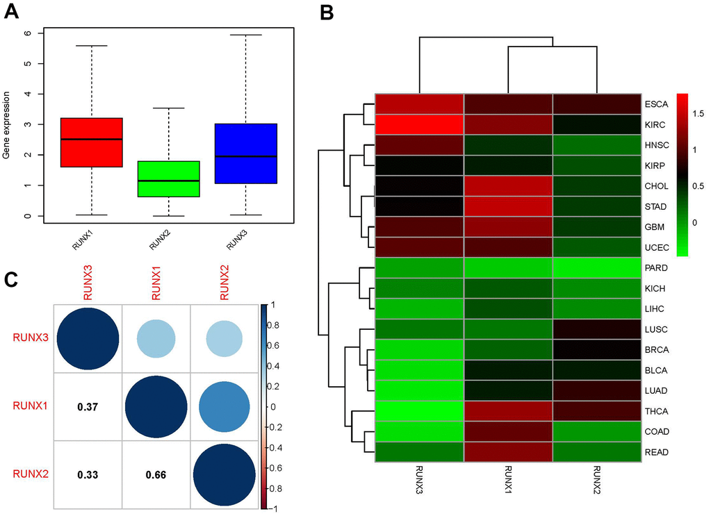 In recent years, accumulating evidence has demonstrated that the RUNX gene family has crucial roles in tumor immunosuppression, determination of biological phenotypes, tumorigenesis, progression, metastasis, therapeutic effect, and patient prognosis, via both direct and indirect effects [6–9]. The RUNX gene family is intimately involved in carcinogenesis: the RUNX1 gene was found to be mutated in human leukemia [10]; and RUNX2 is overexpressed in osteosarcoma and regulates bone remodeling and osteoclast differentiation [11]. Importantly, RUNX2 is closely associated with drug resistance of various malignant cancers [12]. The RUNX3 gene is located on chromosome 1p36, which is a hotspot depleted in various cancer types [13]. RUNX3 is expressed on various solid tumors and may contribute to tumor immunosuppression [14]. However, there is almost no data of the RUNX gene family playing a function in diverse tumor forms in humans.