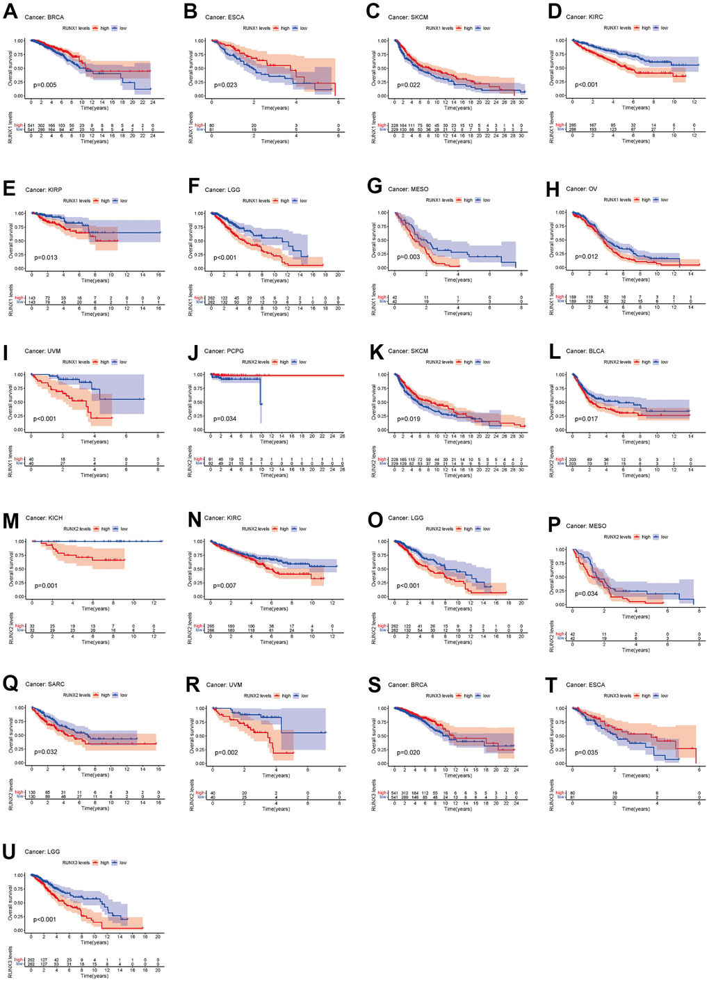 We utilized Kaplan–Meier survival curves to assess patient OS based on clinical data retrieved from TCGA in order to better understand the RUNX gene family’s predictive significance. Of the three family members, RUNX1 predicted the best prognosis in patients with BRCA, ESCA, and SKCM (all p<0.05, Figure 4A–4C). By contrast, in patients with KIRC, KIRP, LGG, MESO, OV, and UVM, RUNX1 indicated a poor prognosis (all p<0.05, Figure 4D–4I). In PCPG and SKCM, RUNX2 played a protective effect (all p<0.05, Figure 4J, 4K). On the other hand, RUNX2 was found to be harmful in seven cancer types: BLCA, KIRC, KICH, LGG, MESO, SARC, and UVM (all p<0.05, Figure 4L–4R). RUNX3 was shown to be beneficial in BRCA and ESCA (all p<0.05, Figure 4S, 4T) but a detrimental role in LGG (all p<0.05, Figure 4U).