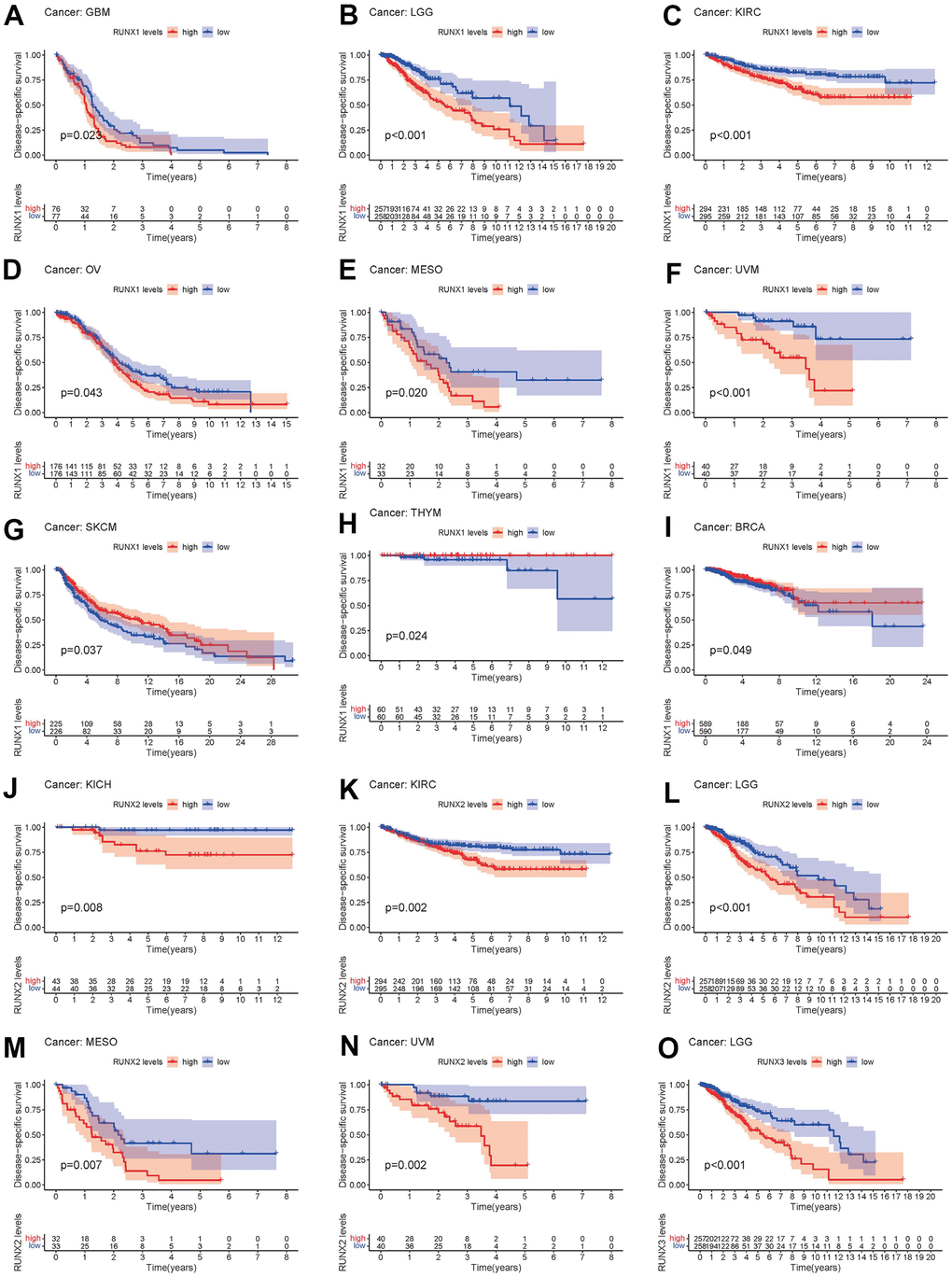 We also examined the correlation between RUNX gene expression and DSS in pan-cancer. Higher RUNX1 expression was linked with poor DSS in GBM, LGG, KIRC, OV, MESO, and UVM, whereas increased RUNX1 expression predicted favorable DSS in SKCM, THYM, and BRCA (all p<0.05, Figure 5A–5I). RUNX2 played a negative influence in KICH, KIRC, LGG, MESO, and UVM (all p<0.05, Figure 5J–5N). RUNX3 was shown to be harmful in LGG (p<0.05, Figure 5O).
