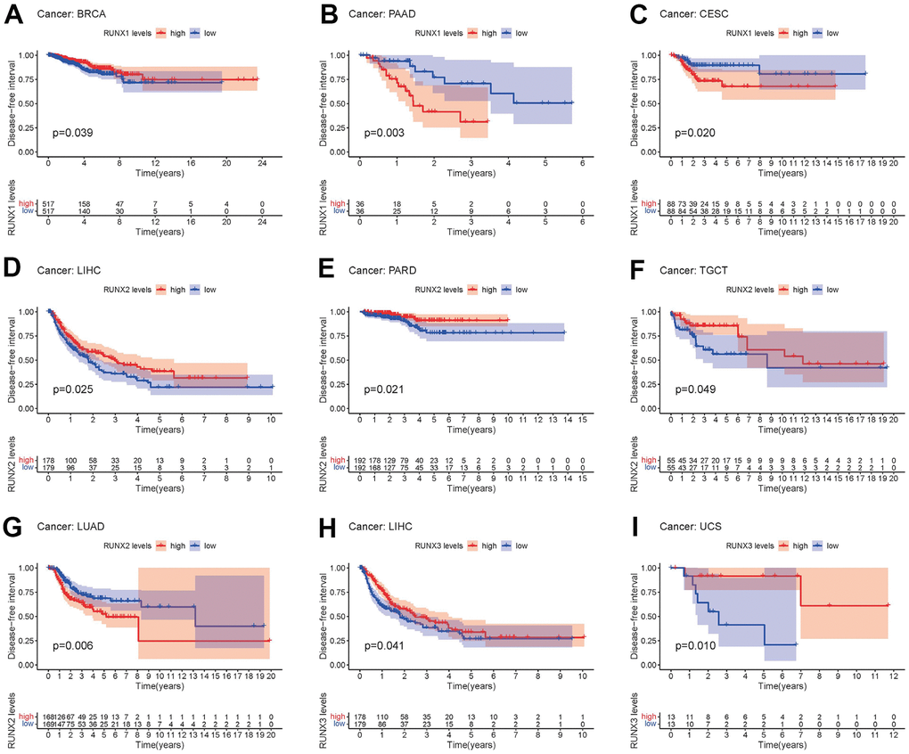 DFI in 33 TCGA tumors is analyzed using the same way. RUNX1 played a protective function in BRCA (p<0.05, Figure 6A). On the other hand, RUNX1 had a negative impact in PAAD and CESC (all p<0.05, Figure 6B, 6C). In LIHC, PARD, and TGCT (all p<0.05, Figure 6D–6F), high RUNX2 expression was a protective factor, while it was all a risk factor in the LUAD (all p<0.05, Figure 6G). In LIHC and UCS, RUNX3 played a protective function (p<0.05, Figure 6H, 6I).