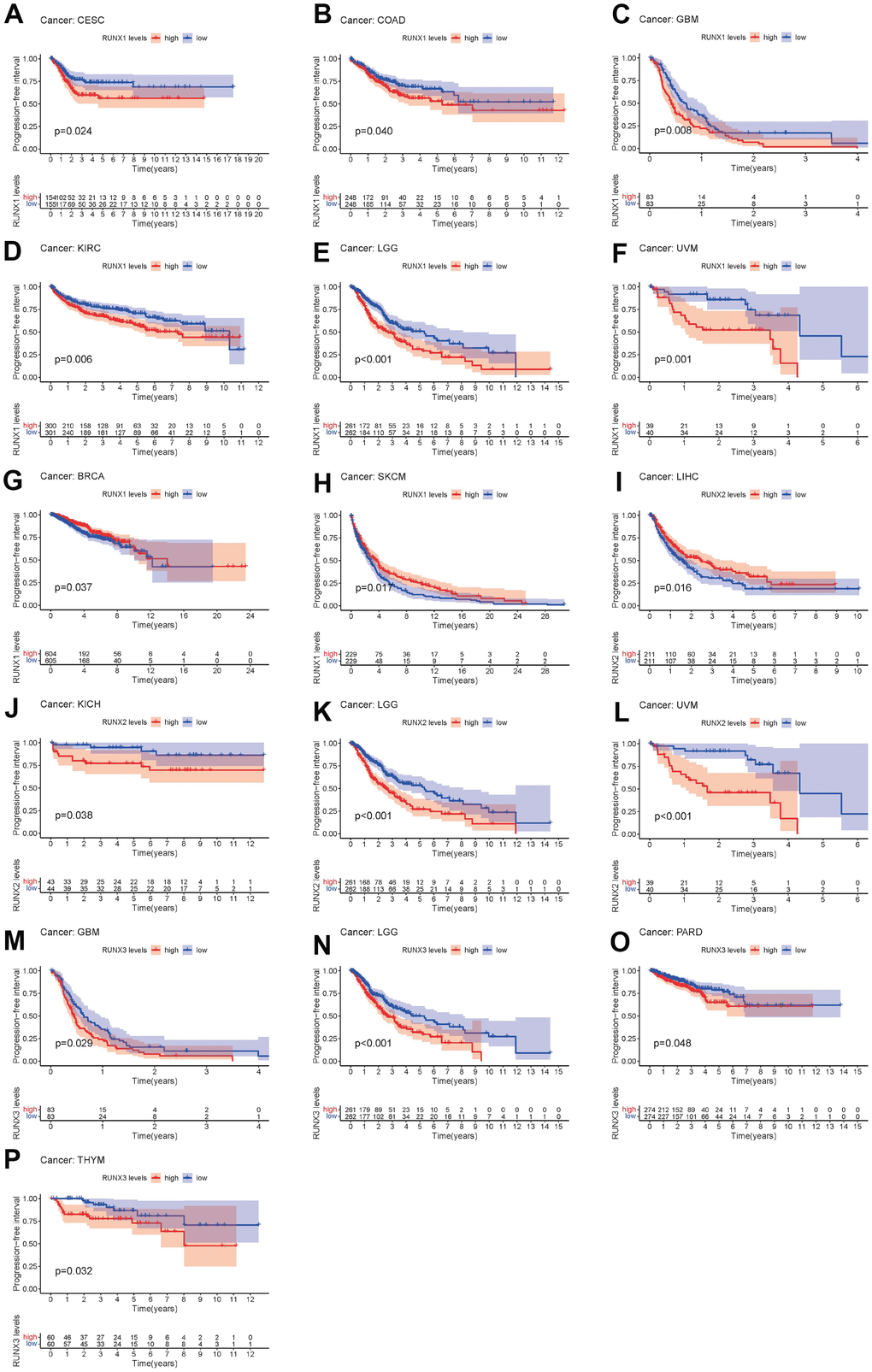 Finally, the PFI was examined in 33 TCGA cancers. RUNX1 expression had a detrimental role in CESC, COAD, GBM, KIRC, LGG, and UVM (all p<0.05, Figure 7A–7F), but was all a protective role in the BRCA and SKCM (all p<0.05, Figure 7G, 7H). The high expression of RUNX2 was a protective factor in LIHC (all p<0.05, Figure 7I), but was all a risk factor in the KICH, LGG, and UVM (all p<0.05, Figure 7J–7L). RUNX3 had a detrimental role in GBM, LGG, PARD, and THYM (p<0.05, Figure 7M–7P).