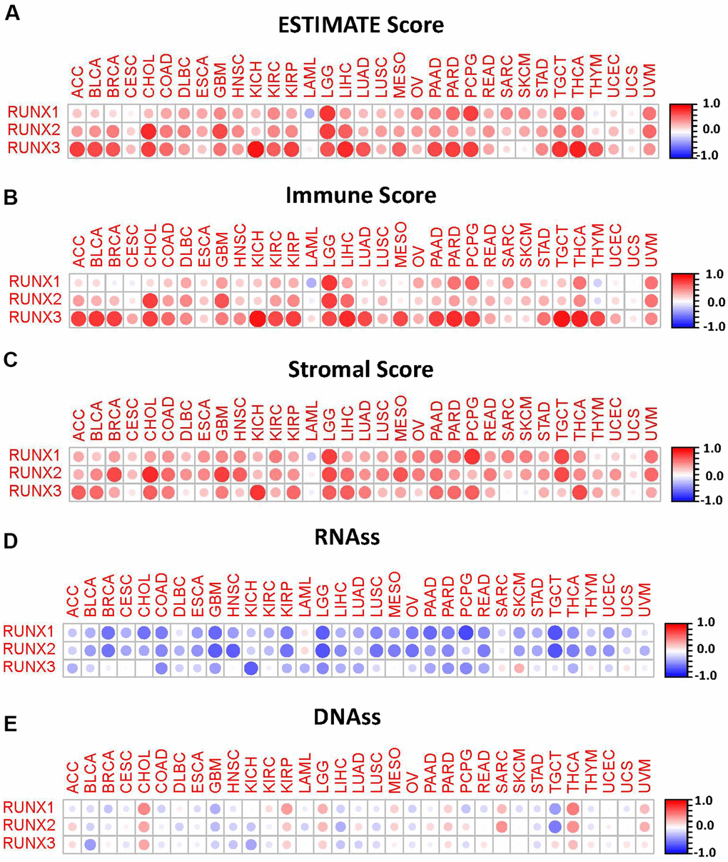 In addition, we assessed the pan-cancer correlations between the RUNX gene family and tumor stemness. Using the TCGA tumor stemness database, RNAss and DNAss were analyzed. Our results showed that the RUNX gene family had a negative correlation with RNAss (Figure 8D). By contrast, it had a positive correlation with DNAss in CHOL, KIRP, LGG, MESO, THCA, and UVM (Figure 8E).