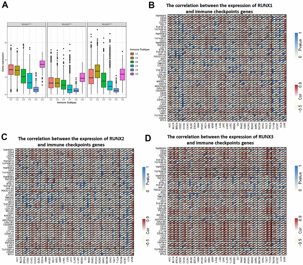 Correlation of RUNX gene family expression with tumor immune subtype and immune checkpoints