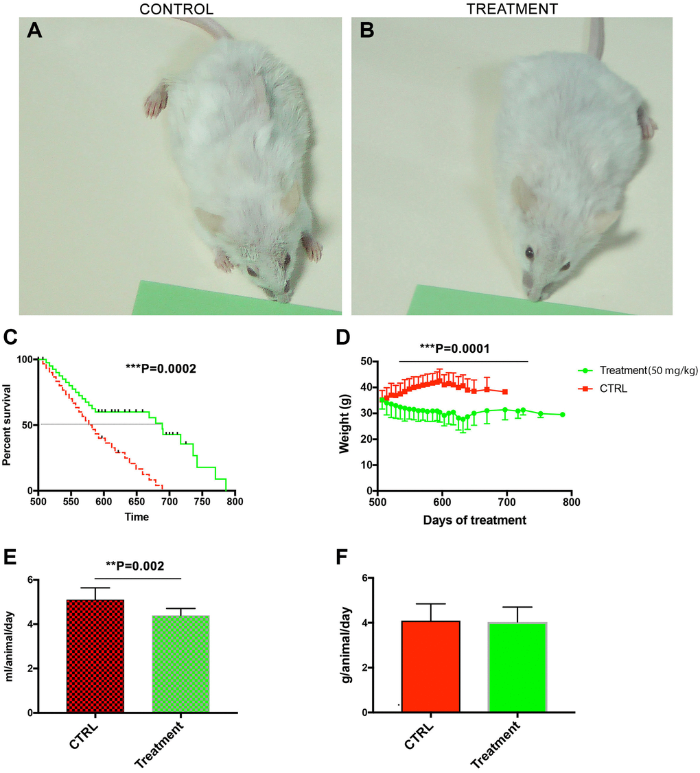 Treatment was initiated at the age of 500 days and continued for 286 days. Macroscopically, the fur of the treated animals looked less ruffled as compared to controls (Figure 1A vs. 1B). The male mice fed with CQ significantly lived longer (786 days) than controls (689 days) (P = 0.0002), and the median lifespan was also significantly different between the two groups (Figure 1C). When the treatment was initiated, the body weights were similar. However, in the control mice gradually there was an age-related increase in the body weight that was prevented by the CQ treatment (P = 0.0001; t-test, two-tailed) between the weight of the control mice and the weight of CQ-treated animals between days 600–700 (Figure 1D). The volume of liquid intake was, on the average, significantly lower (P = 0.002; t-test, two-tailed) in the CQ-treated group (Figure 1E). However, the average amount of consumed food was not significantly different between the two groups (Figure 1F).