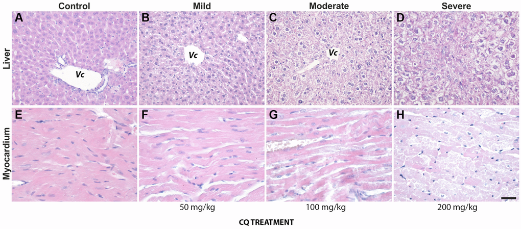 In the heart, interstitial oedema, intercalate disks fragmentation, loss of myocardiocyte striations and even areal necrosis could be seen, more frequent and more intense with increasing treatment dosage (Figure 2, lower panel). However, overall, we noted that the dose of 50 mg/kg of CQ did not cause significant pathological changes in the liver and heart (Figure 2; Table 1).