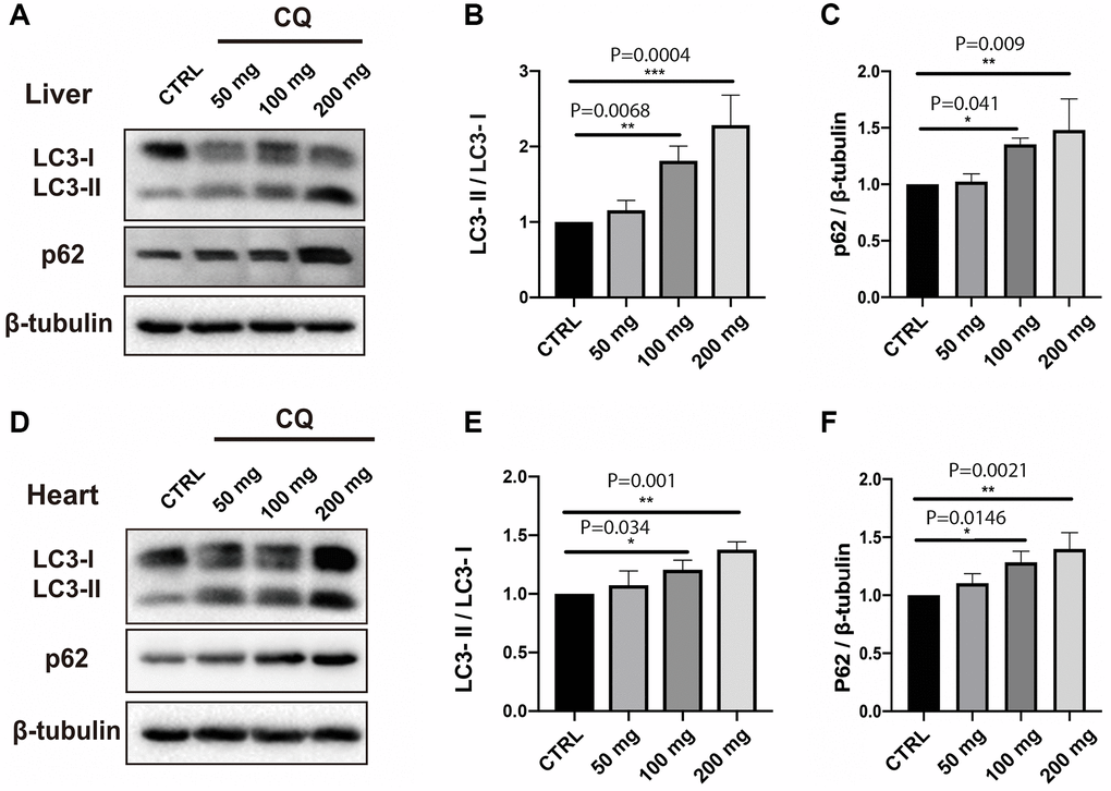 CQ treatment caused an increase in the LC3-II/LC3-I ratio and p62 levels in the liver and heart