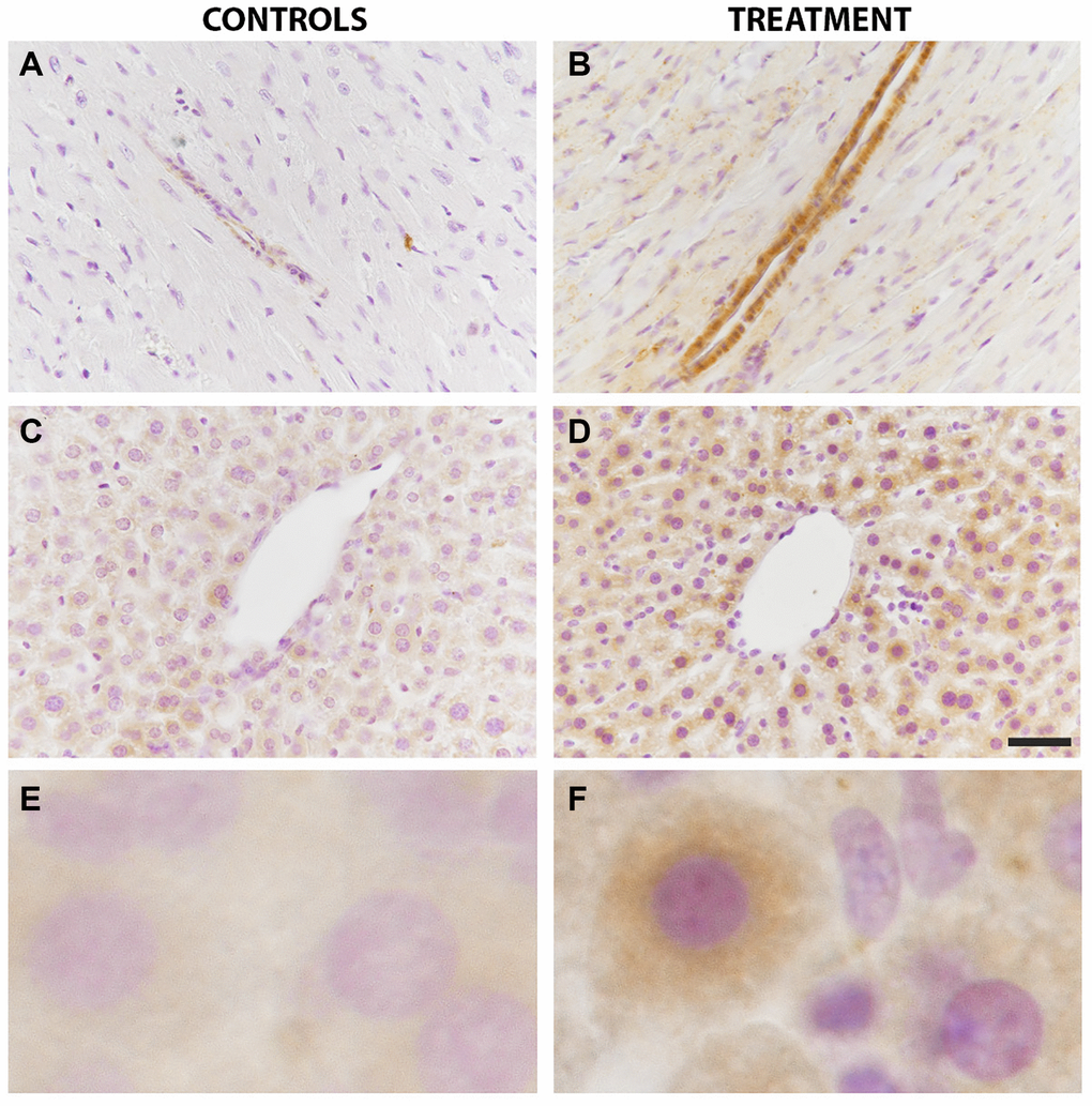 In the liver, LC3B immunostaining showed a diffuse granular pattern in the cytoplasm of hepatocytes, without a preferred disposition in the lobules. LC3B immunostaining was more intense in treated animals as compared to controls (Figure 4C vs. 4D). Enlarged images of LC3B immunostainings in hepatocytes of controls and treated animals are also shown (Figure 4E vs. 4F).