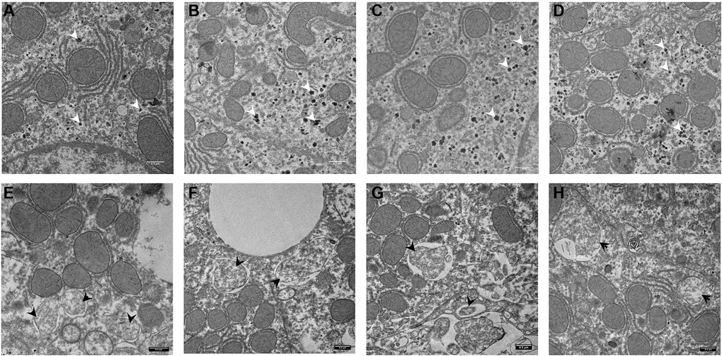 Four animals in each group were analyzed by EM. In the control group we could not see autophagosomes (Figure 5A–5D). Instead, there was a massive accumulation of glycogen granules in the liver cells (white arrowheads). Following CQ treatment, autophagosome-like structures that were encircled by double membranes containing portions of cytoplasmic organelles were detected (Figure 5E–5H; black arrowheads).