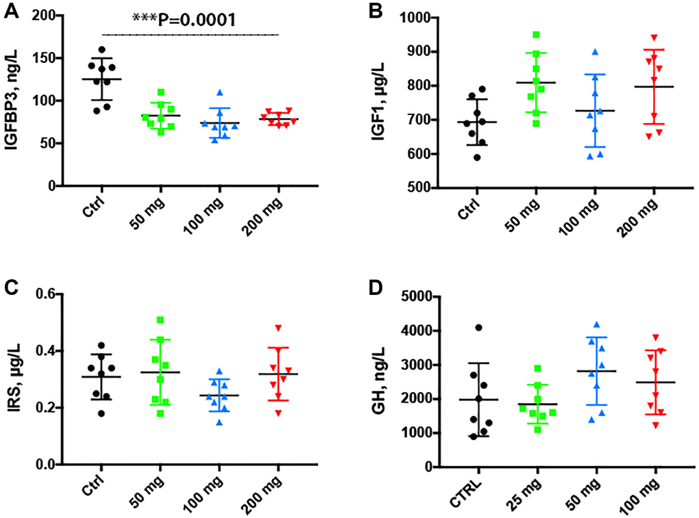 Growth hormone (GH; Cloud-Clone Corp. Wuhan, China), insulin-like growth factor 1 (IGF-1; RayBio, Norcross, GA, USA), insulin-like growth factor binding protein-3 (IGFBP-3; RayBio, Norcross, GA, USA) and insulin receptor substrate-1 (IRS-1; Cloud-Clone Corp. Wuhan, China) were determined in serum of controls and treated animals by ELISA following the manufacturer’s instructions.