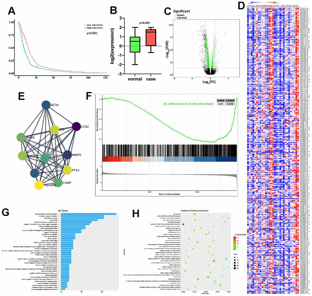 Firstly, the GSE86569 dataset consisting of HF samples was obtained to assess the role of PTX3 in HF. Survival analysis showed that the high expression level of PTX3 was linked to a lower overall survival rate (Figure 1A). Moreover, we found that the PTX3 was upregulated in patients with HF compared to healthy controls (Figure 1B), suggesting that PTX3 may play a role in HF progression. The DEGs were shown in the volcano plot and heatmap (Figure 1C, 1D). A total of 325 DEGs were identified, of which 155 were up-regulated and 170 were down-regulated. Through PPI network analysis, we found that PTX3 interacted with cAMP and matrix metalloproteinases (MMPs), including MMP8 and MMP9 (Figure 1E). Moreover, GSEA showed that PTX3 expression was substantially linked to the pathways related to IL6 production (Figure 1F). GO and KEGG analysis demonstrated that the IL-6 production pathway, inflammatory response pathway, GTPase activity pathway, and cell surface receptor pathway were all enriched in HF (Figure 1G, 1H). In short, the bioinformatics analysis indicated that PTX3 may be involved in HF progression, and correlated with the inflammatory response in HF.