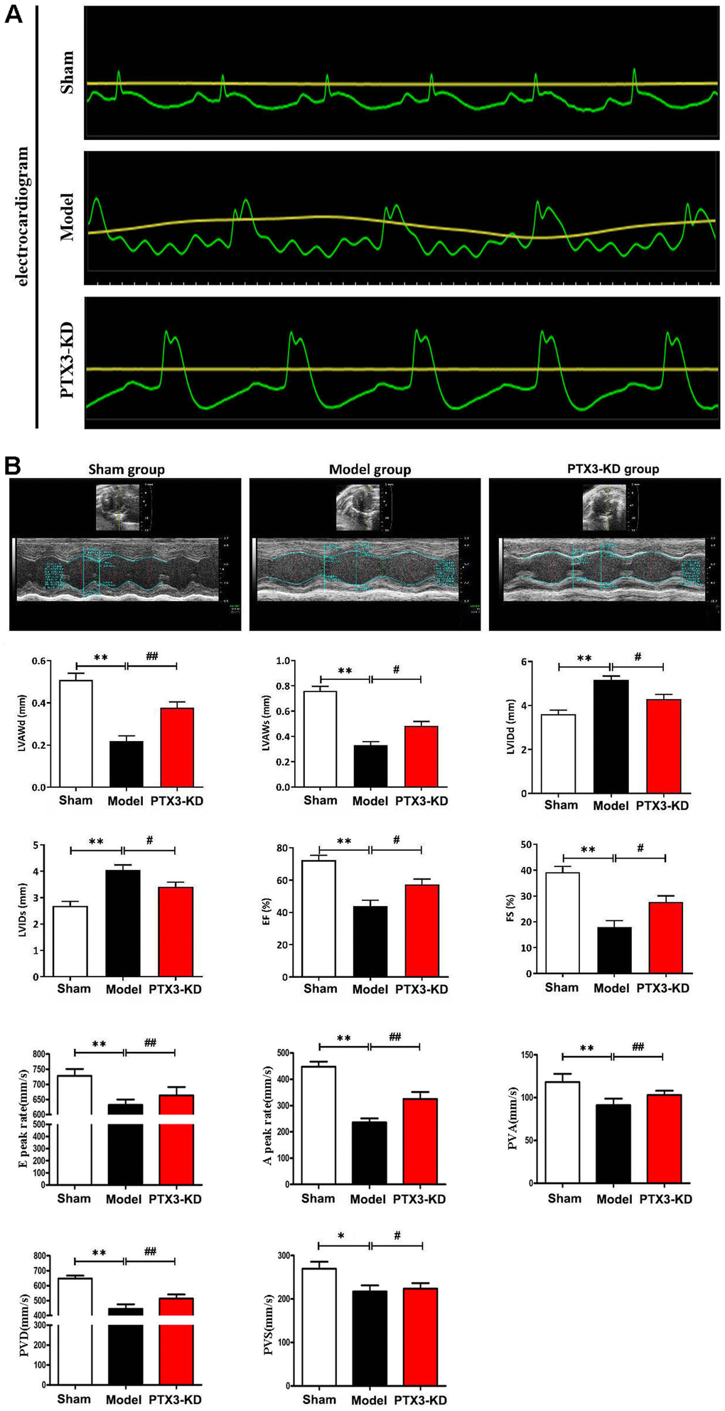 To verify the role of PTX3 KD in the improvement of HF after MI, coronary artery ligation was performed in mice. The mice who survived 6 h after coronary artery ligation were given either a lentiviral vector encoding PTX3 KD (PTX3-KD group, n=10) or an empty vector (model group, n=10) for induction. All of the animals made it to the end of the research period. Control (n=10), model (n=10), and PTX3-KD (n=10) animals were all subjected to M-mode echocardiography. Electrocardiogram results showed the MI model is shown in Figure 2A. Representative echocardiography images of different mice are shown in Figure 2B. Echocardiographic measurements demonstrated that mice in PTX3-KD group had lower LVAWd, LVAWs, ES and FS, but higher LVIDd and LVIDs compared with those in model group, as well as PTX3-KD improved the E and A peak rate, PVA, PVD, PVS compared with Model-group (Figure 2B), indicating the PTX3-KD Successfully improved the systolic and diastolic function of the heart of murine HF after MI. It was found that the changes of echocardiographic parameters in murine HF after MI were all reversed after PTX3 KD, demonstrating that PTX3 KD improves the cardiac functions.