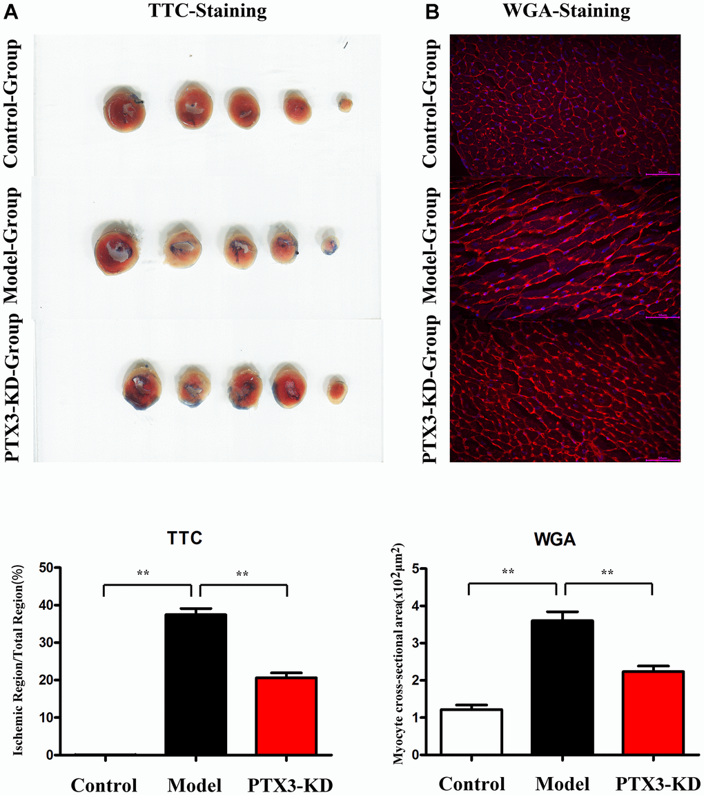 PTX3 KD reduced the infarct areas and cardiomyocyte hypertrophy in MI mice