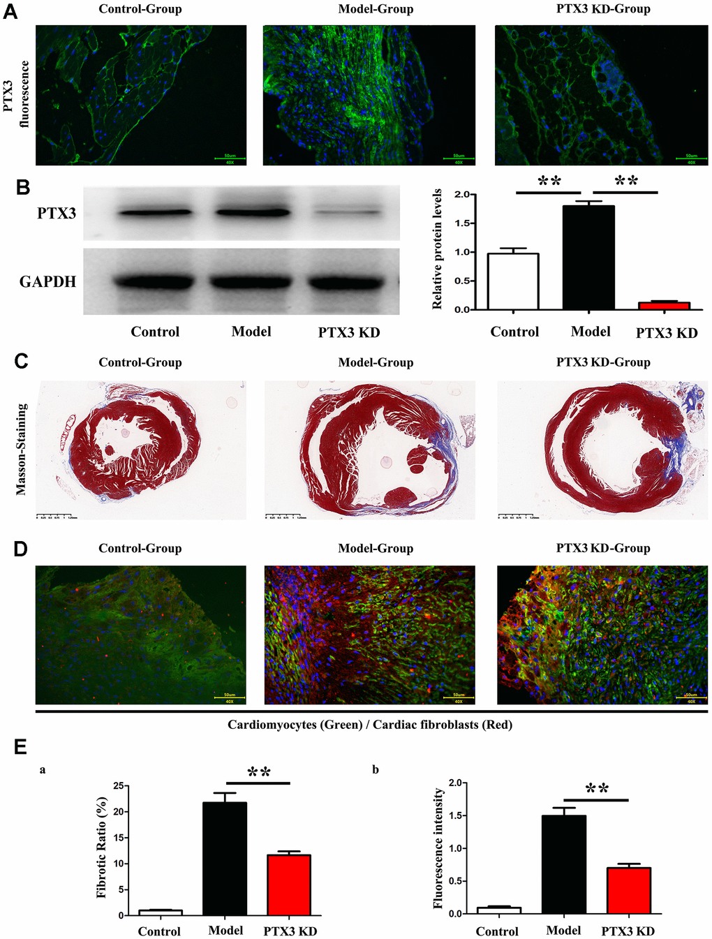 The present study demonstrated that PTX3 KD decreased the cardiac fibroblasts and altered the ECM by suppressing the expression collagen I and collagen III. It can be seen that PTX3 KD protects the cardiac function and counteracts the myocardial fibrosis in HF after MI. Additionally, we preliminarily proposed the potential mechanism that PTX3 KD exerted the cardioprotective effect through suppressing the IL-6/STAT3 pathway.