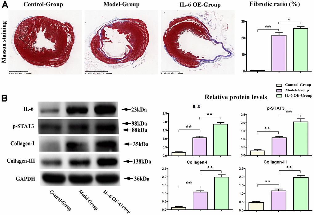 To determine the effects of IL-6/STAT3 signals in fibrosis of MI, the IL-6 OE lentivirus were used to specifically active STAT3 (Phosphorylated form) in heart, and the results showed that over expression of IL-6 could increase the fibrotic areas after MI and shown in Figure 6A. The relative proteins of IL-6 and phosphorylated STAT3 (p-STAT3) as well as fibrosis associated proteins: collagen I/III were tested by western blot and our results showed the over expression of IL-6 could significantly aggravate and promote the expression of IL-6, p-STAT3 as well as collagen-I/III, shown in Figure 6B, these results intensely indicated the IL-6/ STAT3 signal plays the pivotal roles in fibrosis of MI in hearts, and PTX3’ roles on IL-6/STAT3 signals could effectively influence the progression of fibrosis in MI.