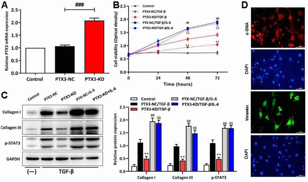 To confirm the results of the in vivo studies, cardiac fibroblasts from C57/BL6J mice were extracted and transfected with PTX3 KD vector. As shown in Figure 7A, qRT-PCR showed the expression of PTX3 was the lowest in cardiac fibroblasts in PTX3-KD group. Next, under the stimulation of TGF-β (to stimulate fibrosis in vitro), transfected fibroblasts were treated with IL-6 (an activator for STAT3 signalling) to verify the role of IL-6/STAT3 pathway in the PTX3 KD-mediated cardioprotective effect. CCK-8 assay showed that the cell viability of cardiac fibroblasts with PTX3 KD was obviously lower than that of NC (Figure 7B). Conversely, the cell viability was significantly enhanced after IL-6 exposure (Figure 7B). Meanwhile, Western blotting revealed that the PTX3 KD down-regulated the expression of collagen I and collagen III, further supporting that PTX3 KD counteracts fibrosis (Figure 7C). In addition, after activating the IL-6/STAT3 pathway (shown as up-regulation of p-STAT3 in Figure 4C) by IL-6, we observed that the PTX3 KD-induced down-regulation of collagen I and collagen III was remarkably reversed (Figure 7C). Overall, these above results indicate that PTX3 KD inhibits the viability of cardiac fibroblasts by down-regulating the IL-6/STAT3 pathway. The fibroblast cells were identified by staining with a-SMA (red) and vimentin (green), the specific marker for fibroblast, these results were shown in Figure 7D.