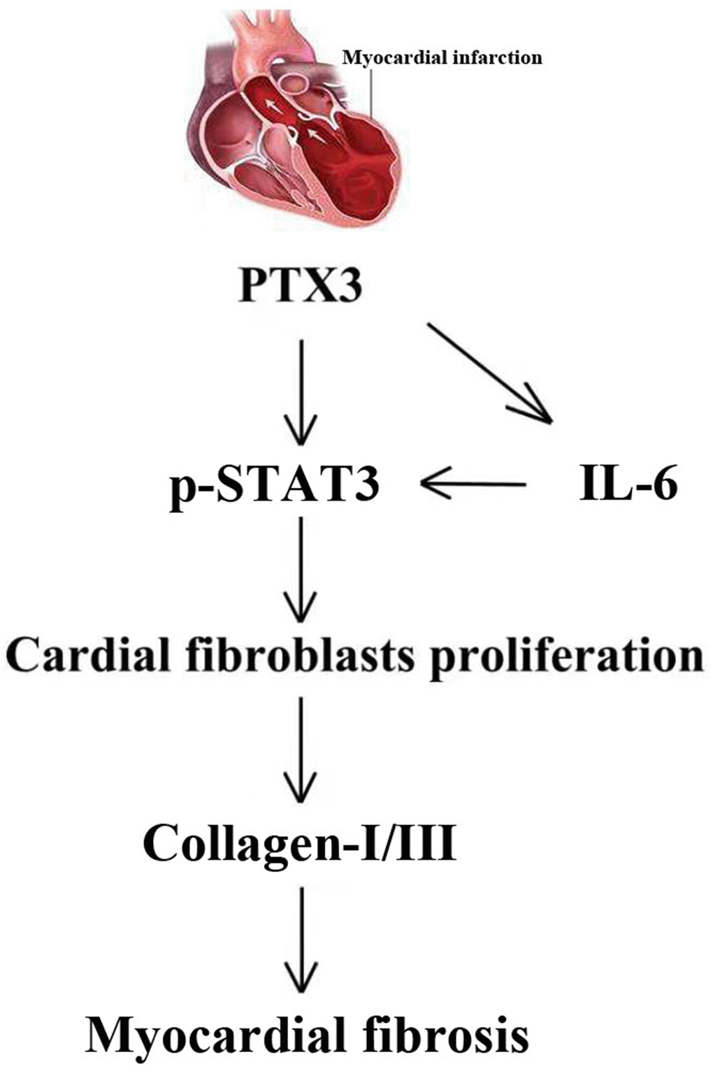 In summary, the study results demonstrate that PTX3 KD plays a cardioprotective role in HF mouse models. PTX3 can counteract the myocardial fibrosis by inhibiting the IL-6/STAT3 pathway, implicating that PTX3 KD may acts as a therapeutic target for HF after MI. Illustrating the molecular mechanism of PTX3 in myocardial fibrosis provides insights on the transfer of the new mechanistic knowledge on HF pathology into potential biomedical applications.
