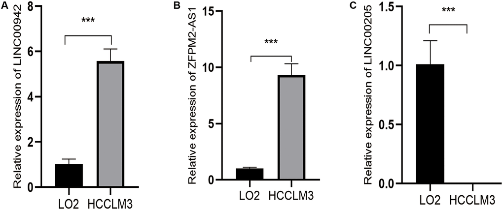 Compared with normal human hepatic epithelial cell lines LO2, LINC00942 and ZFPM2-AS1 were remarkedly upregulated in HCCLM3 cell lines (Figure 10A, 10B, P < 0.001), while LINC00205 was significantly downregulated (Figure 10C, P < 0.001).