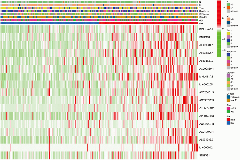 In this study, 376 patients were recruited to acquire their RNA-sequence data, which was extracted from TCGA-LIHC databases on June 22, 2021 (https://portal.gdc.cancer.gov/repository). Table 1 displays the clinical characteristics of the patients. The corresponding ferroptosis-associated genes were available from FerrDb [15], which is a consortium based on the web, providing the latest and all-round information on ferroptosis markers, their regulatory molecules, as well as associated diseases. In all, 246 ferroptosis-associated genes (Supplementary Table 1) were identified. We used the “limma” software package to calculate the correlation of expression between lncRNAs and ferroptosis-associated genes and identify ferroptosis-related lncRNAs (|Pearson R| > 0.4 and p <0.001). Clinical and pathological data of HCC patients, including gender, age, grade, stage, time, status, and TMN were collected. The remarkable differential expression of ferroptosis-related lncRNAs was defined as |log2FC|≥1 and false discovery rate (FDR) <0.05. Firstly, the function of up-regulated and down-regulated ferroptosis-associated differentially expressed genes (DEGs) were explored. Then, Gene ontology (GO) was used to assess the biological pathways related to the DEGs. Based on the data from Kyoto Encyclopedia of Genes and Genomes (KEGG), the R software and ggplot2 were used to analyze the biological processes, molecular functions and cellular components controlled by differentially expressed long non-coding RNAs associated with ferroptosis.