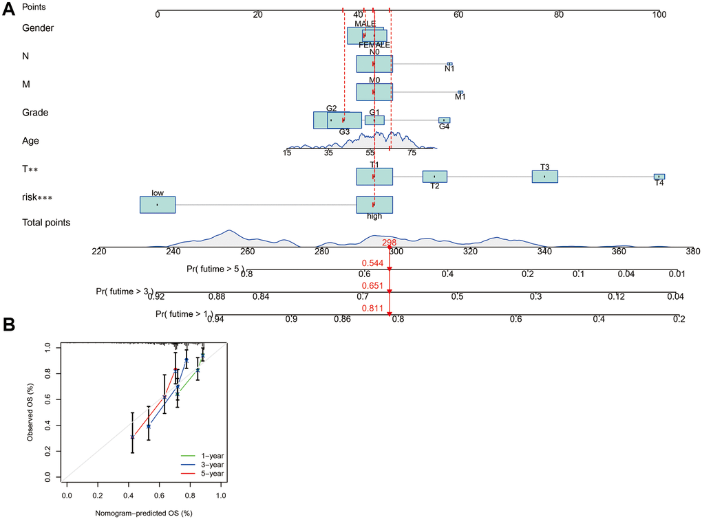 Using the R package of “rms”, the clinical features (age, gender, grade, T stage, M stage, and N stage) and risk score were utilized to construct a prognostic nomogram to predict the 1-, 3-, and 5-year OS of patients with HCC. Each variable in the nomogram scoring system was matched with a score, and the overall score was calculated by summing the scores from all variables in each sample [17]. The nomogram calibration plots were utilized to show the predictive value between the forecasted 1-, 3-, and 5-year OS and the practically observed results.